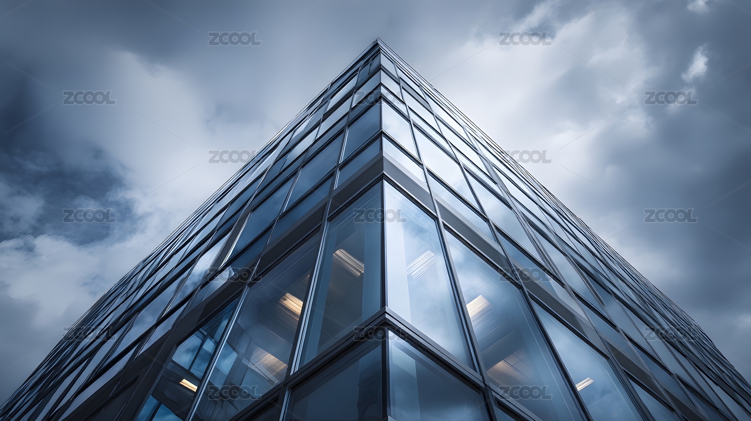 现代玻璃建筑在阴云下的倒影