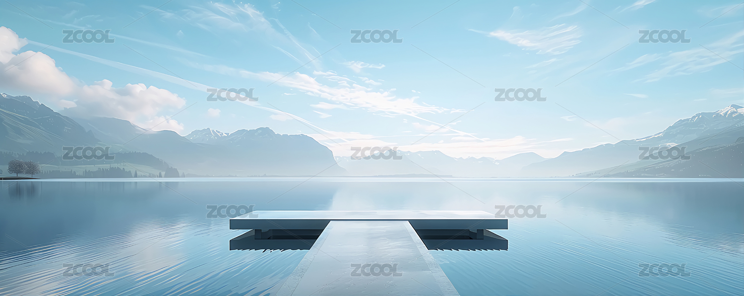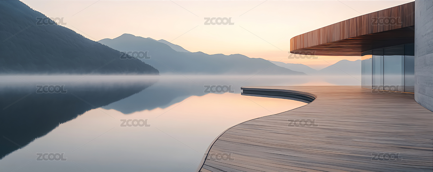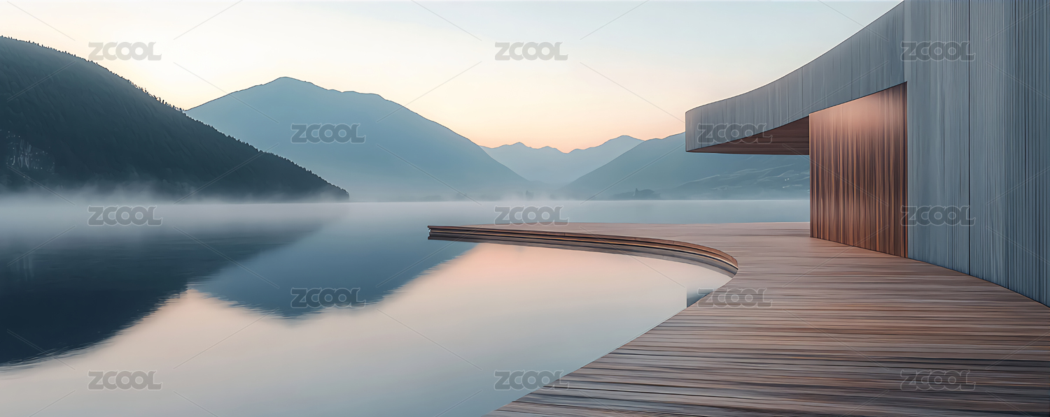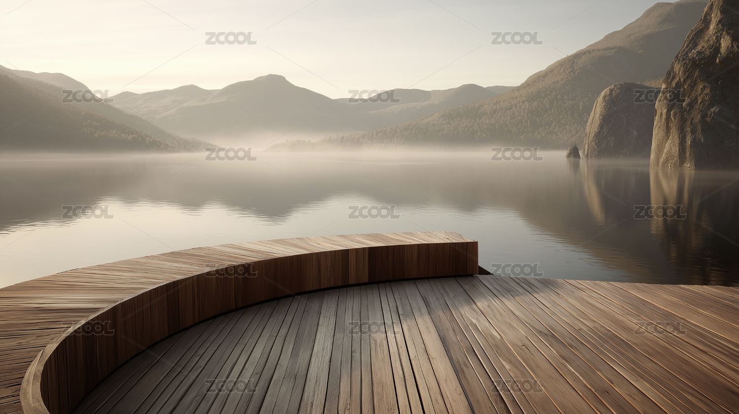 平台,木质,曲线,湖景,远山,雾气,纹理,自然,北欧,设计