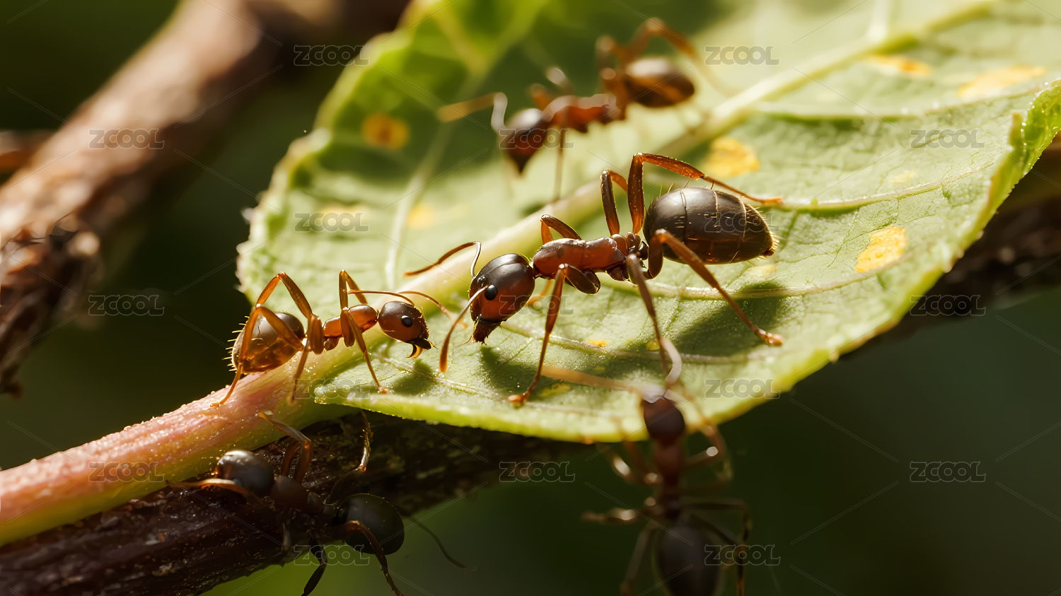 清晨一群蚂蚁正在吸食蚜虫的蜜露