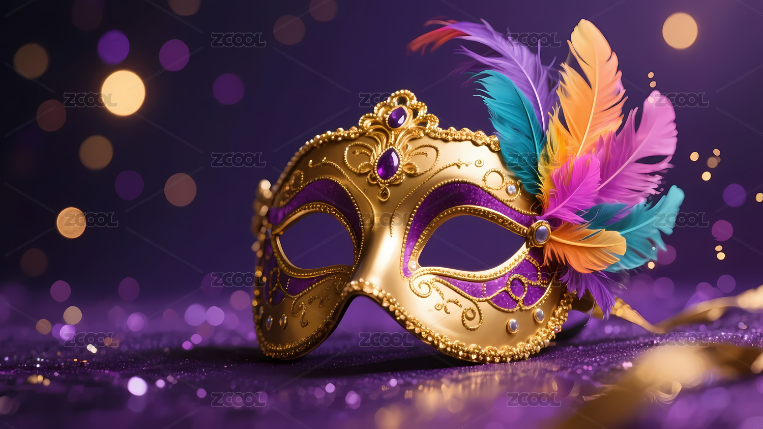 华丽金色面具与紫色羽毛