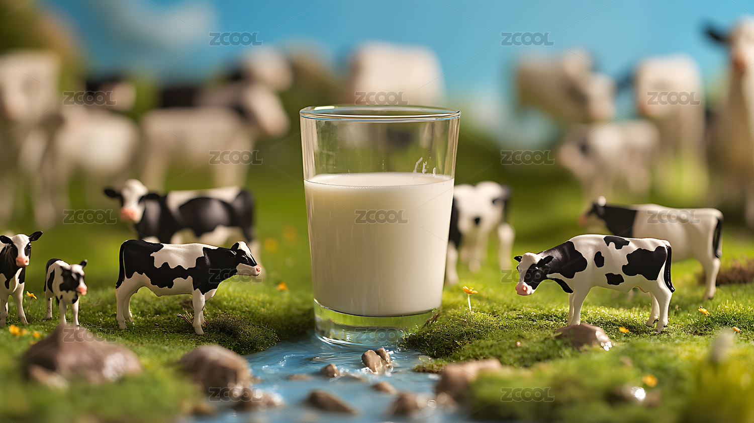 微缩创意一杯牛奶与奶牛牧场