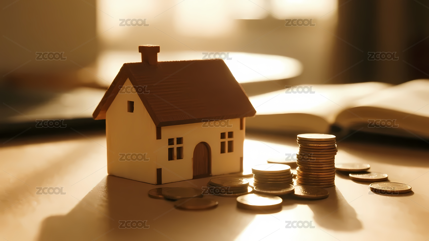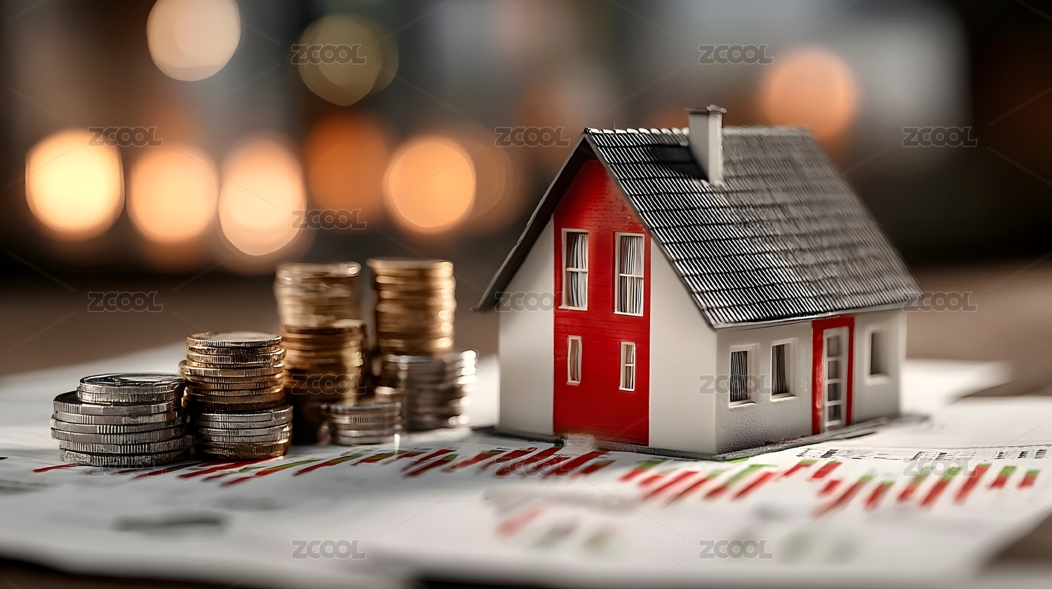桌子上的文件资料和资料上的美元硬币和小房子模型