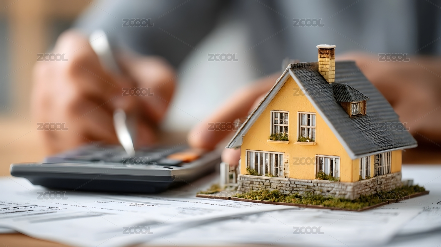 金融文件上的小房子模型和美元硬币及旁边一个计算器