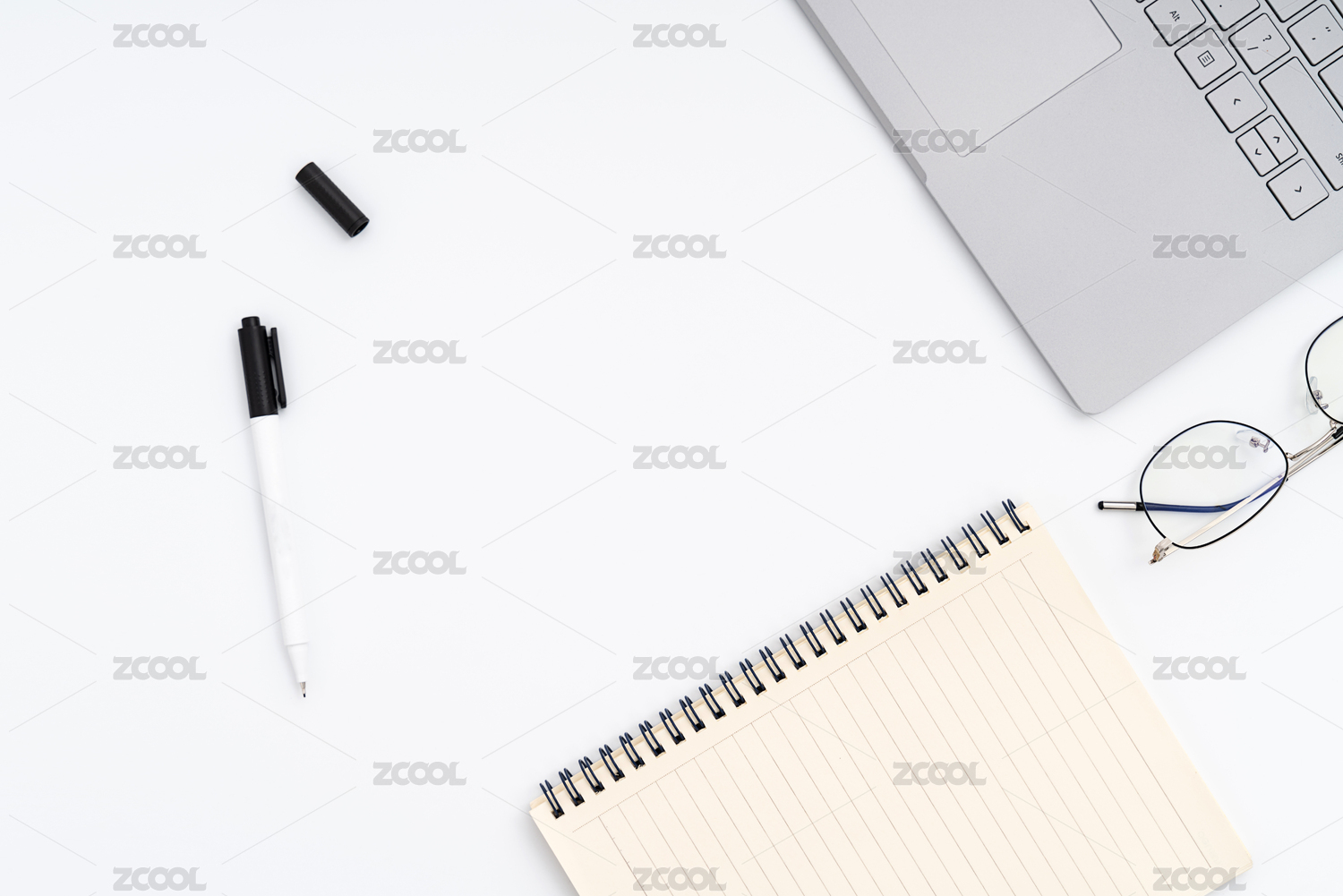 白底办公桌上摆放的彩笔、笔记本眼镜等文具