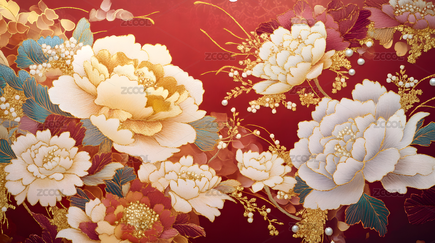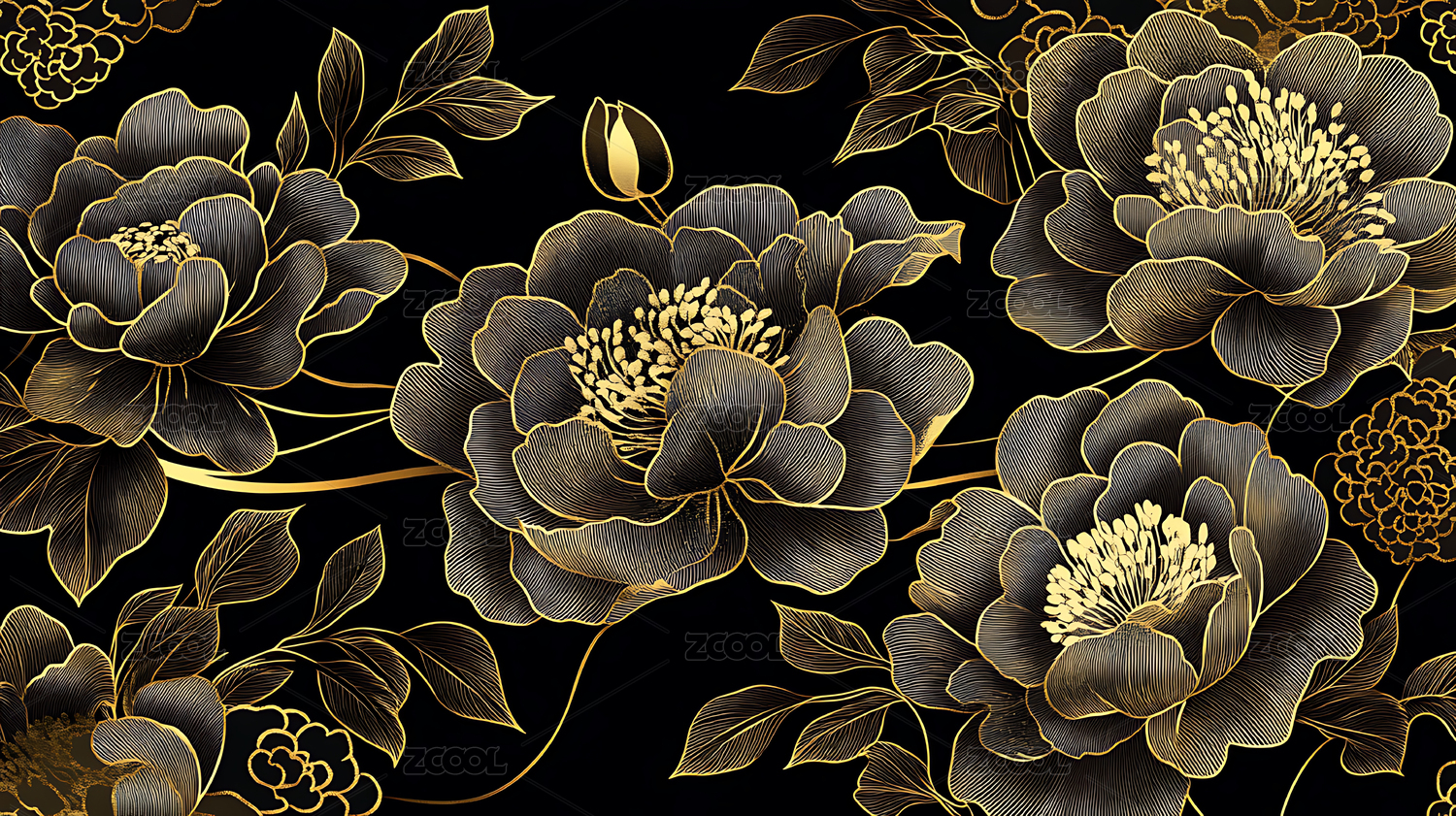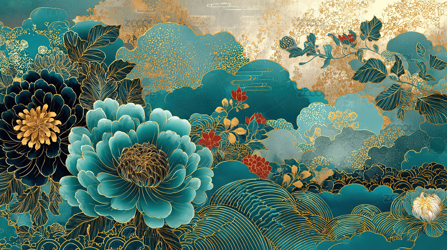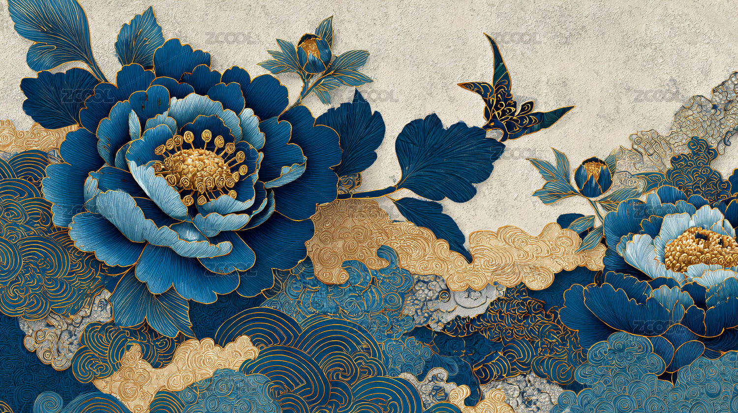 蓝金,牡丹,祥云,装饰,国风,插画,艺术,传统,花卉,祥瑞