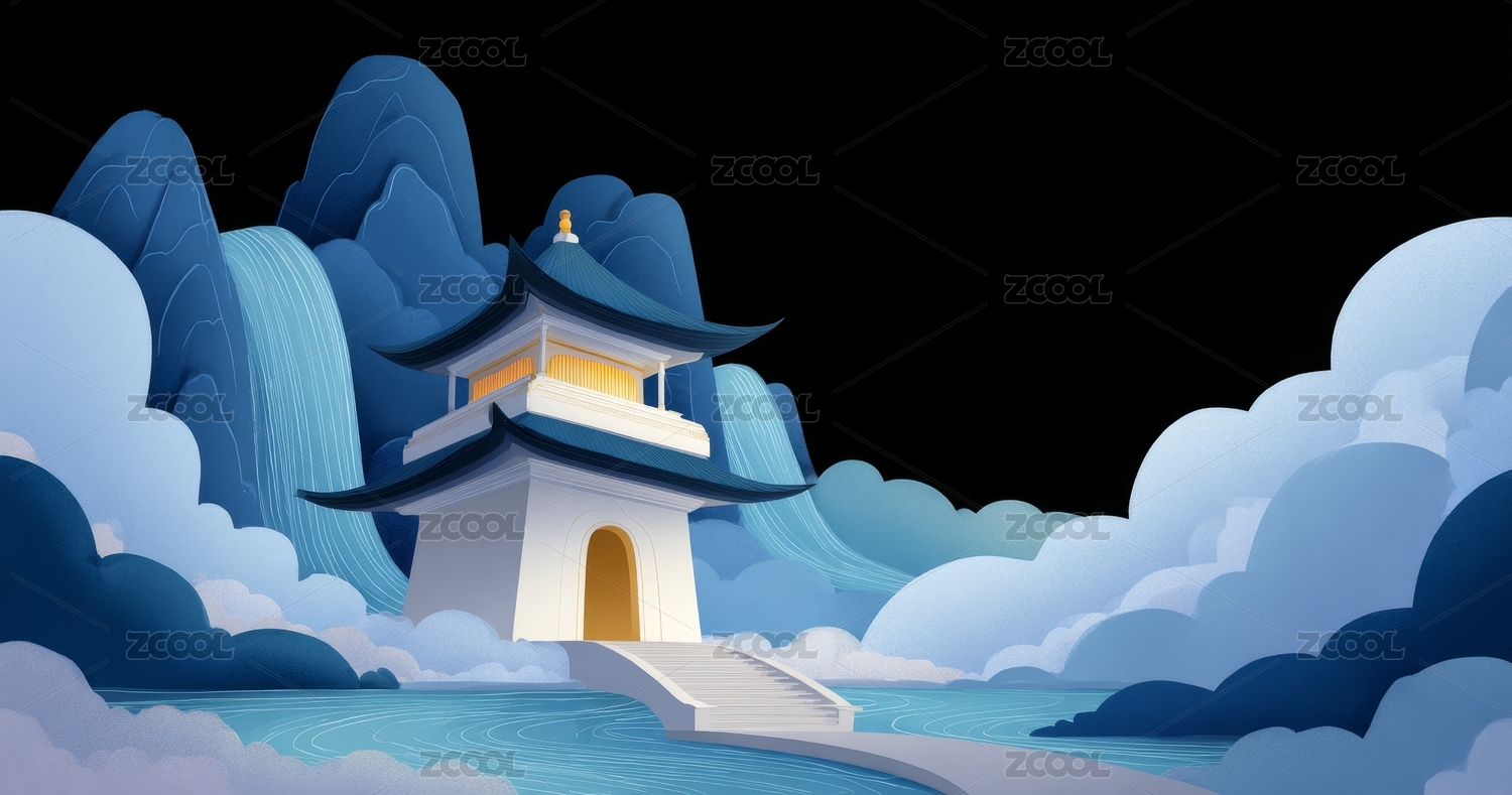 3D卡通古代建筑蓝色剪纸风户外风景插画