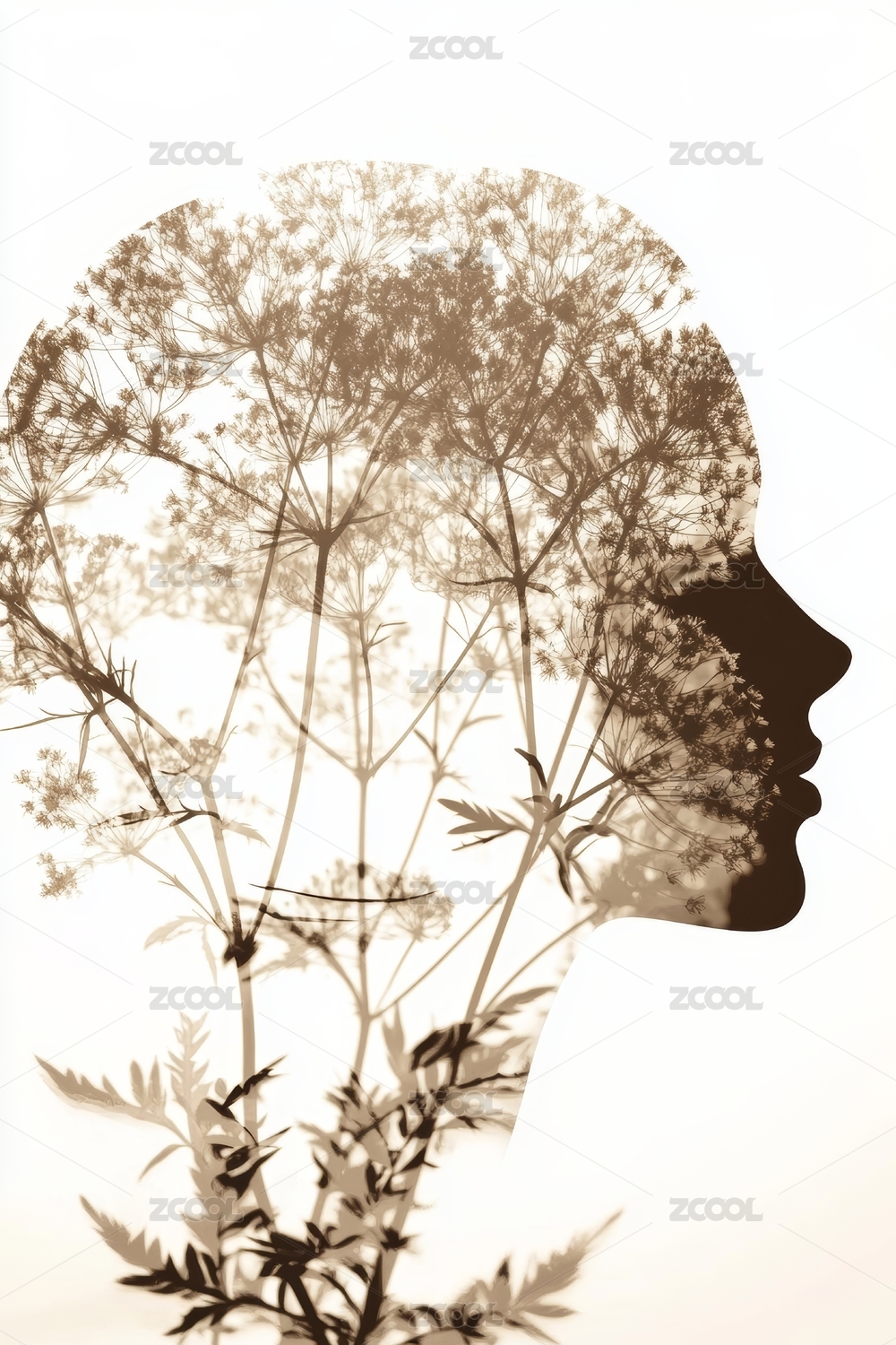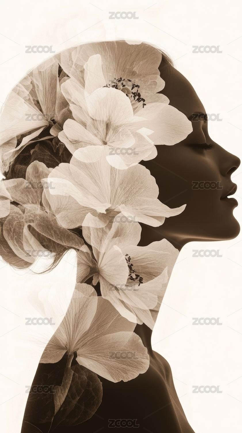 人像花朵二次曝光拼贴水彩复古时尚插画背景