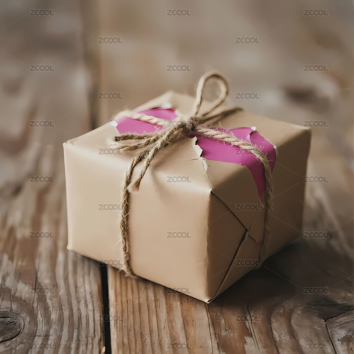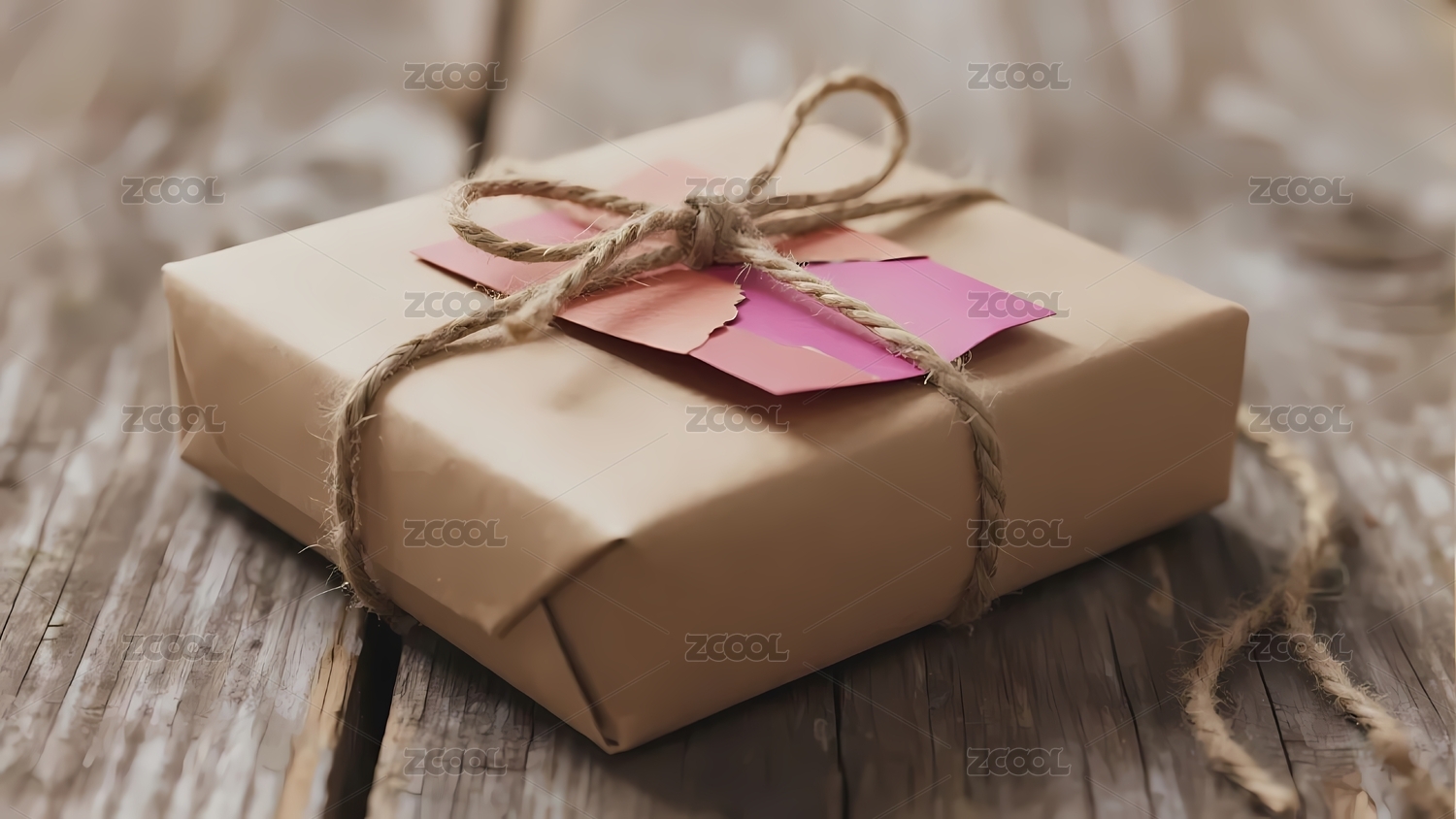 简约牛皮纸包裹系有麻绳和粉色卡片