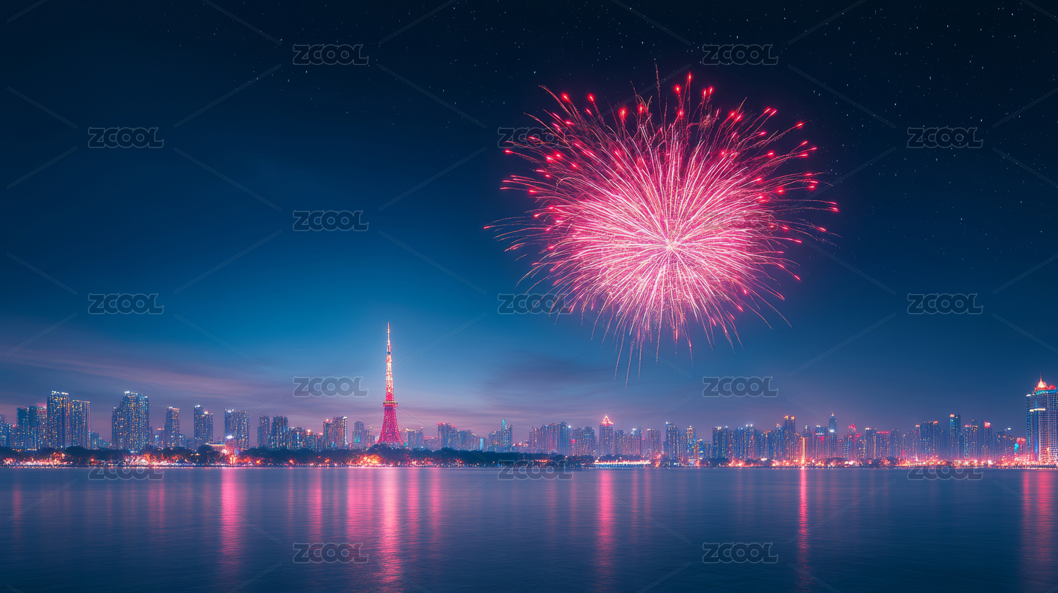 蓝色,黄色,粉色,烟花,夜晚,城市,天际线,庆祝,水面,色彩