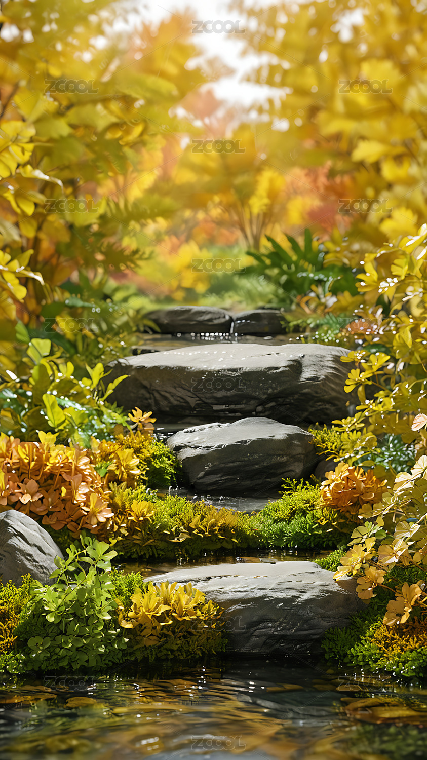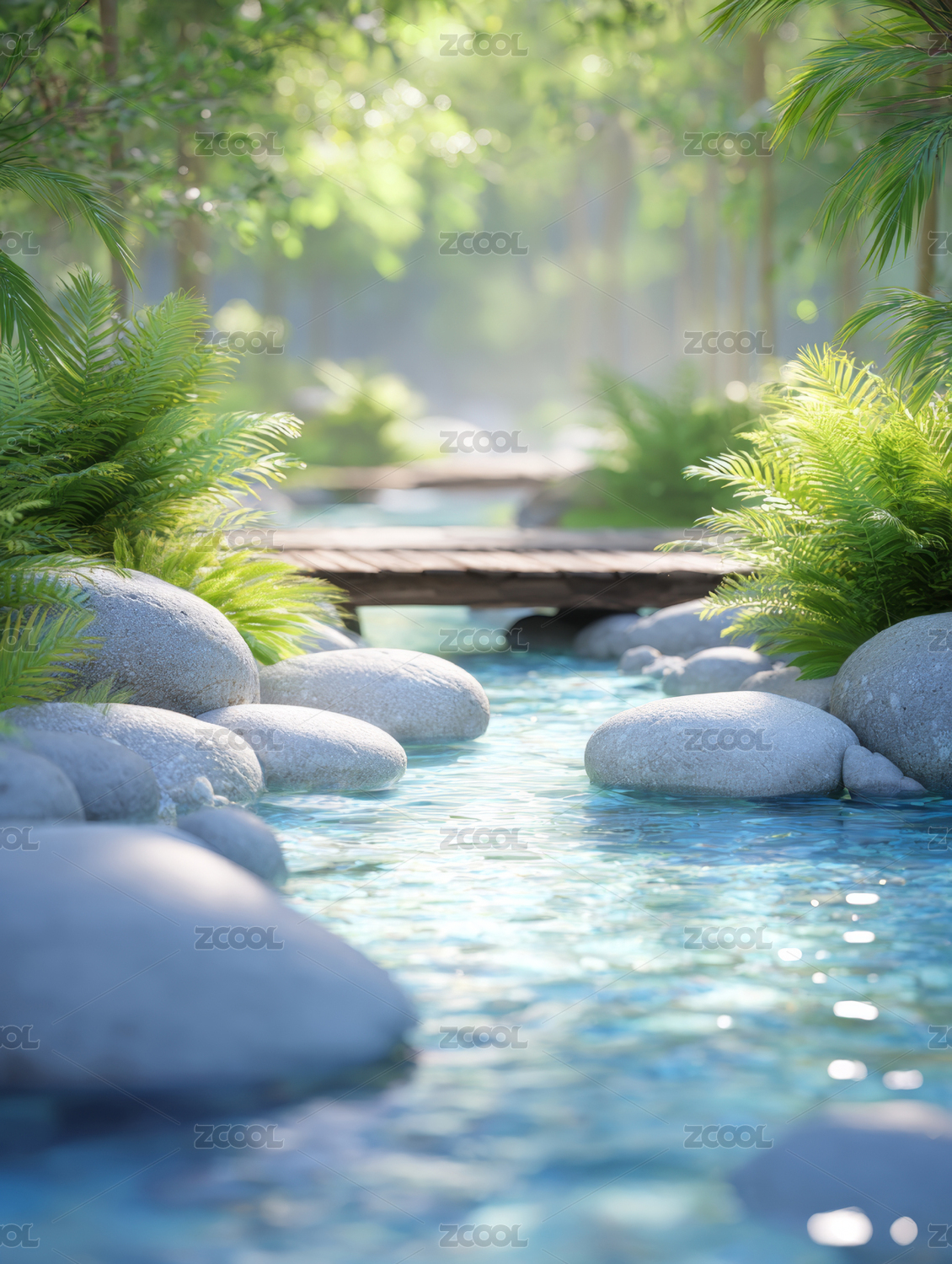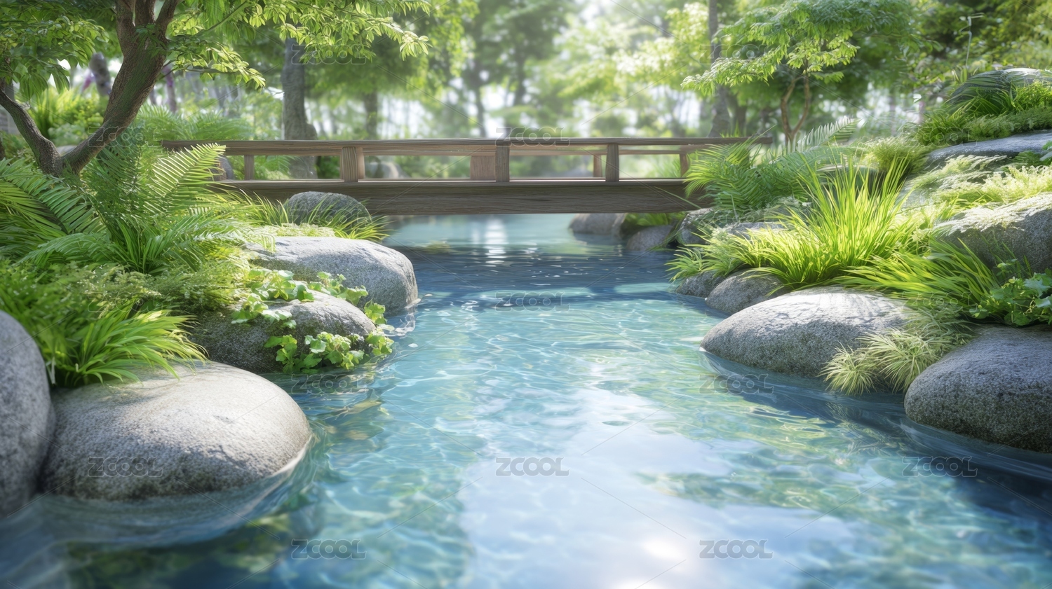 森林,溪流,小桥,石头,绿植,自然,流水,阳光,宁静,生态