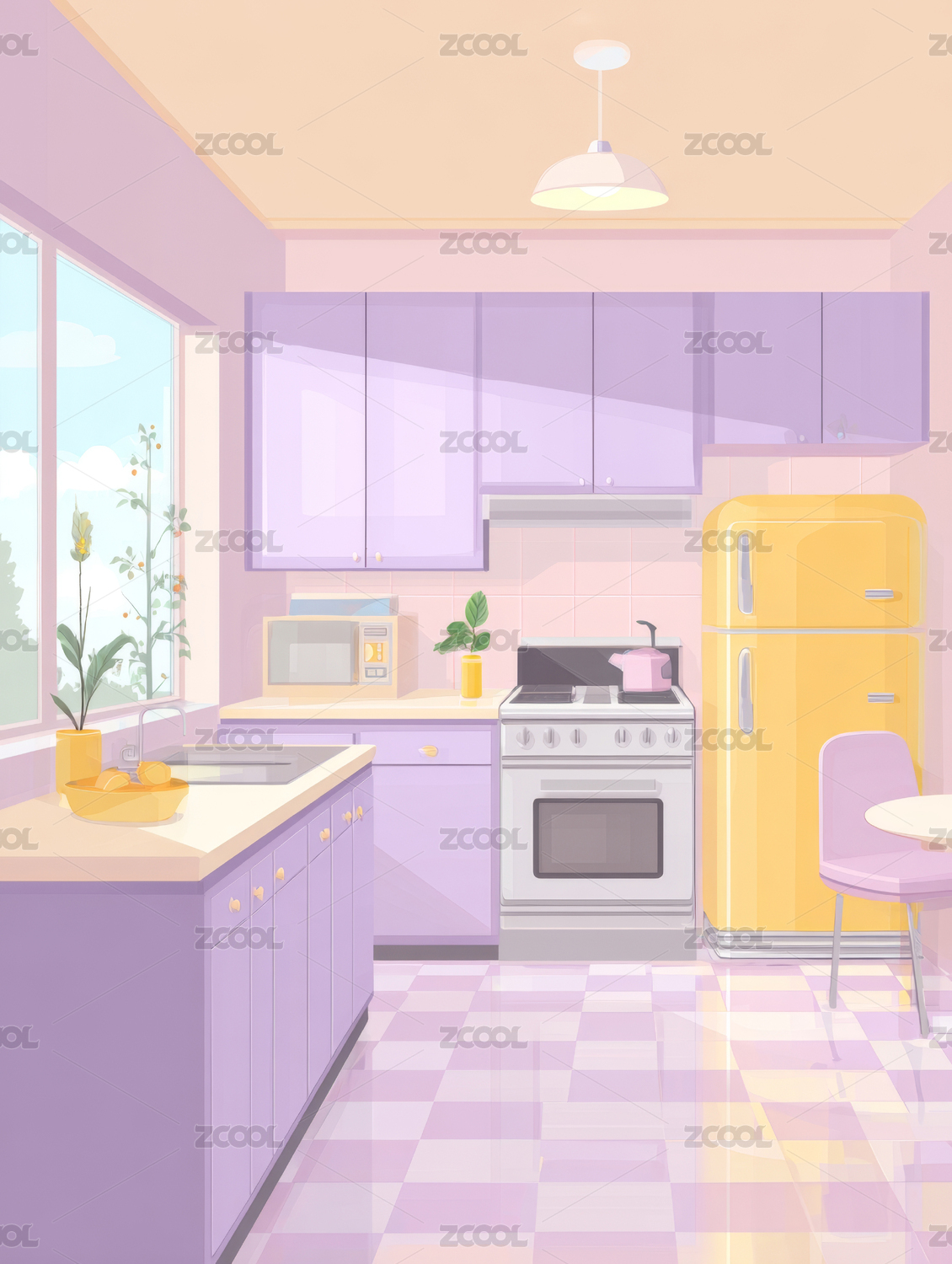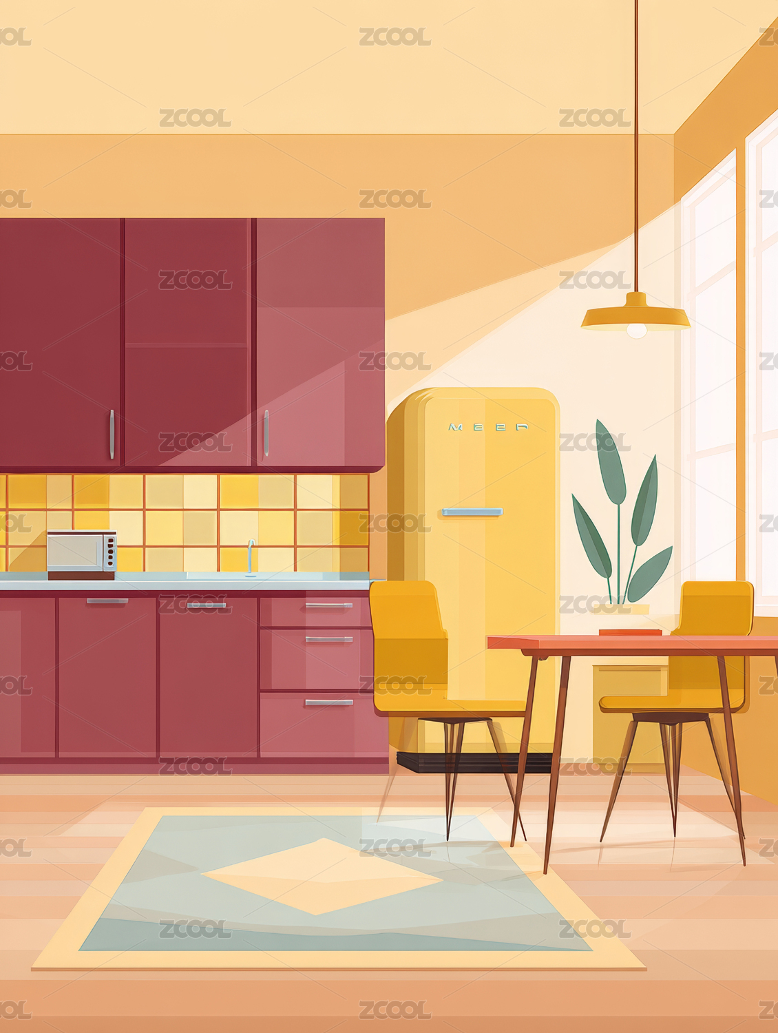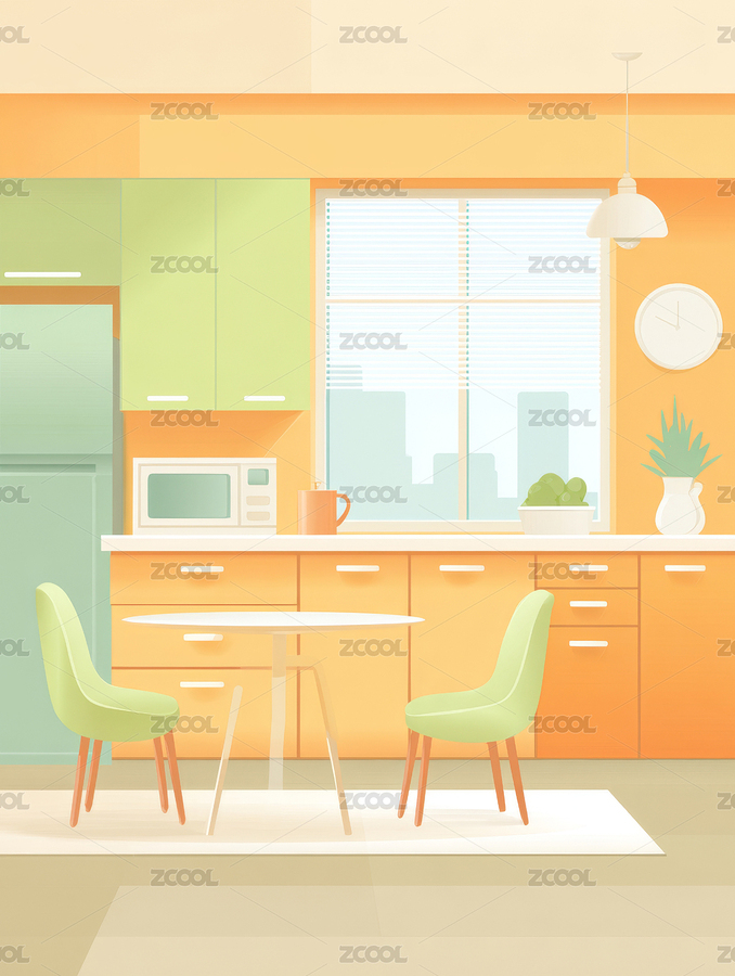 厨房,餐桌,椅子,橱柜,窗户,植物,微波炉,吊灯,钟表,地毯