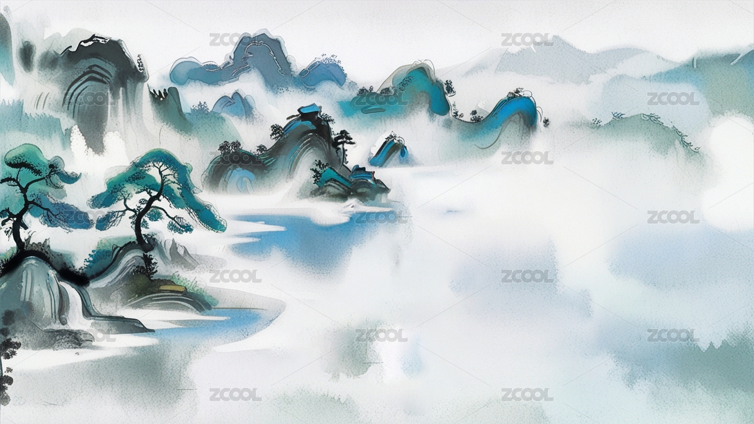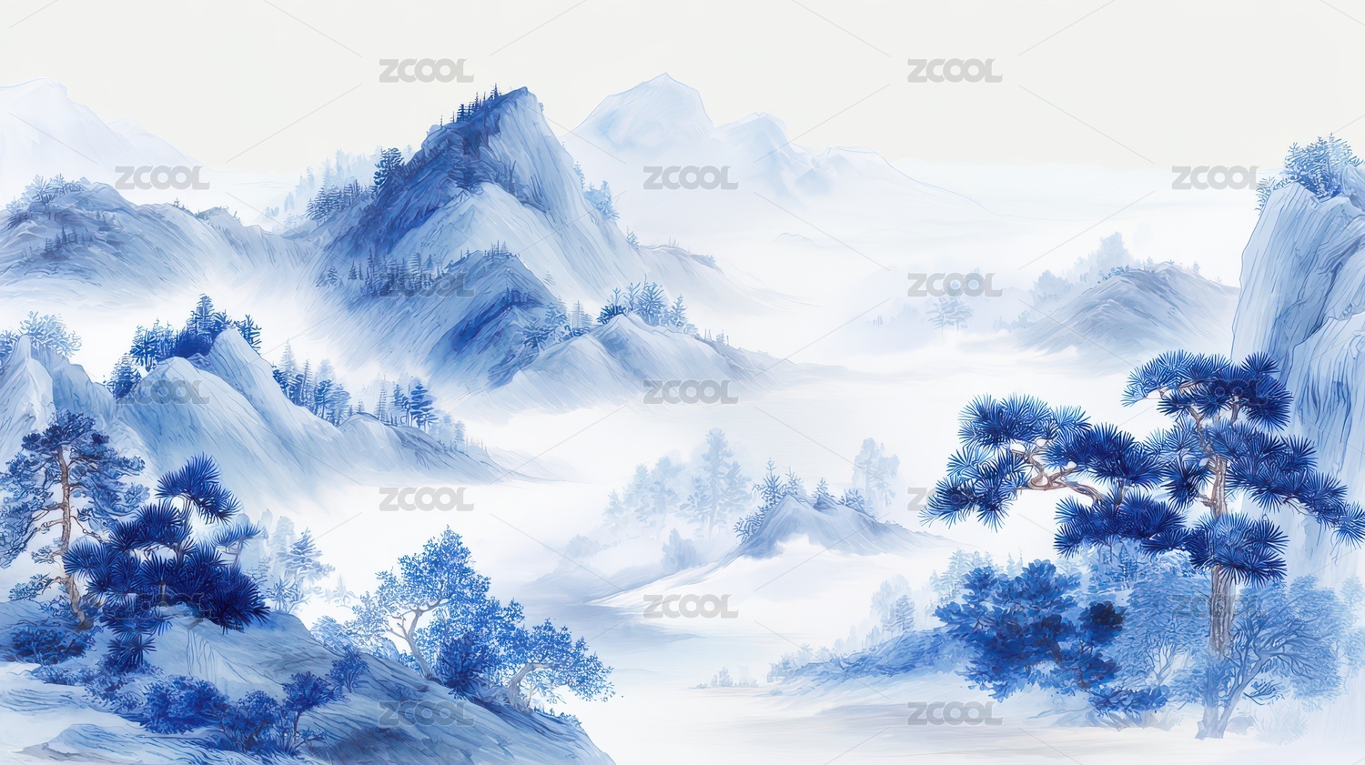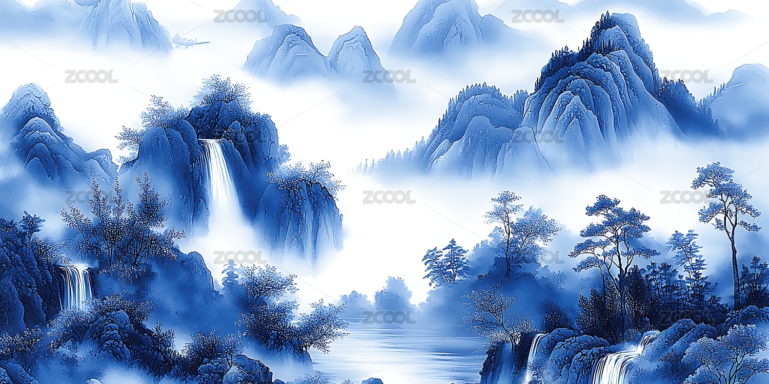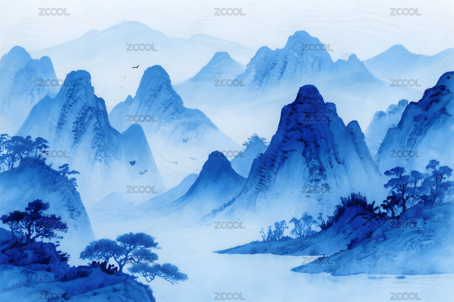 意境,水墨,中式,蓝色,新中式,山水,云雾,树木,绘画,蓝调