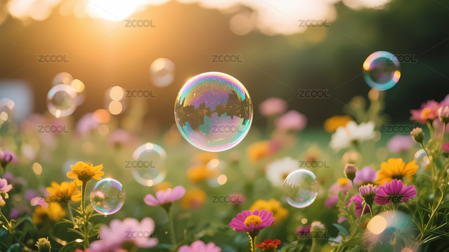 梦幻夕阳花丛彩色泡泡