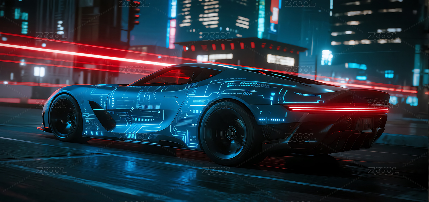 赛博朋克未来汽车沿着公路驶向远处的城市
