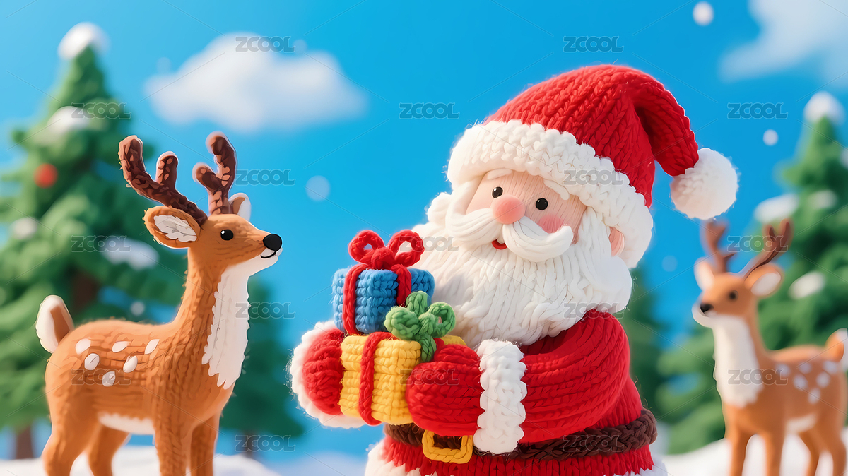 圣诞节毛线材质的毛茸茸的圣诞老人和驯鹿