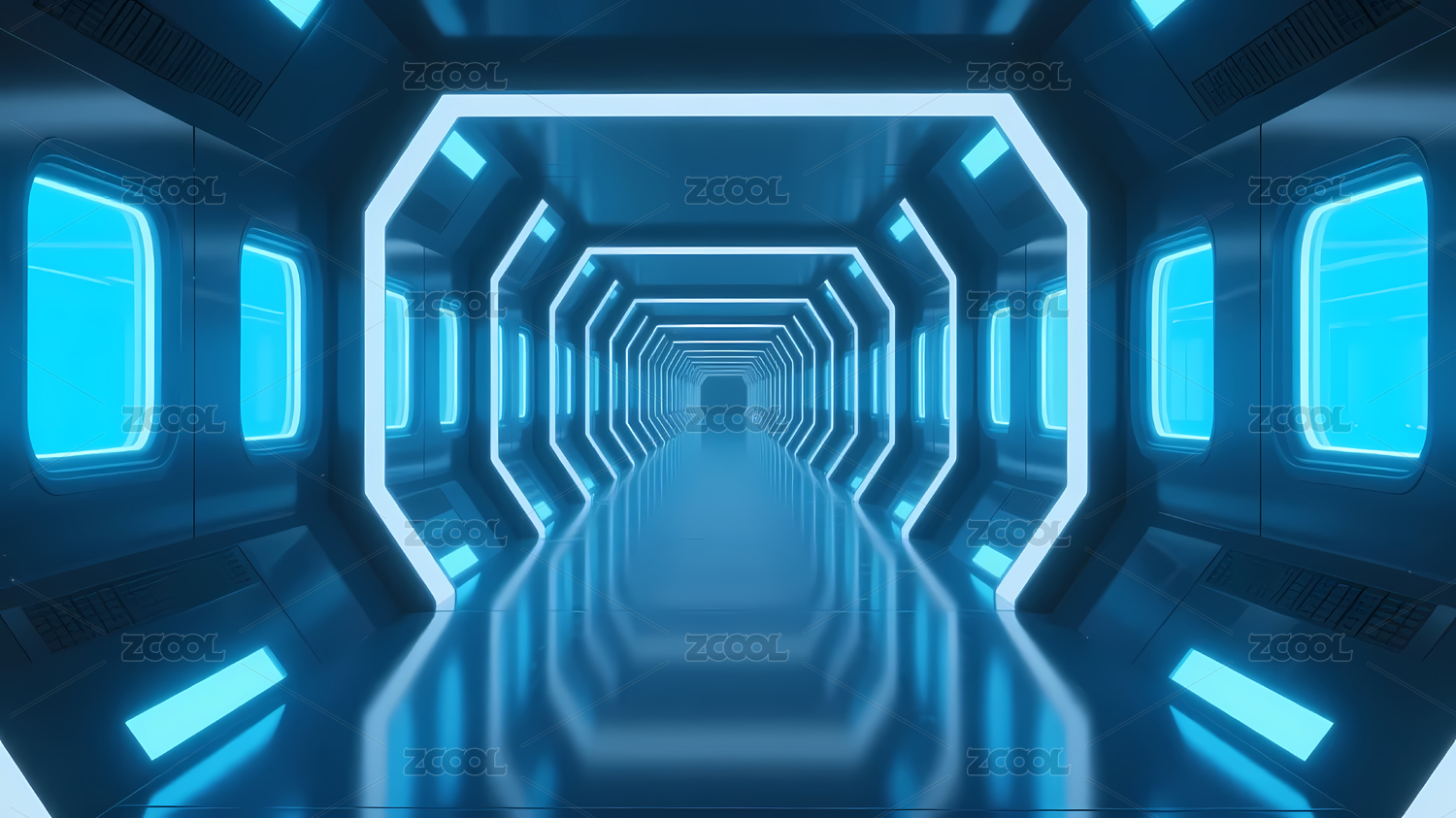 蓝色霓虹走廊与金属背景
