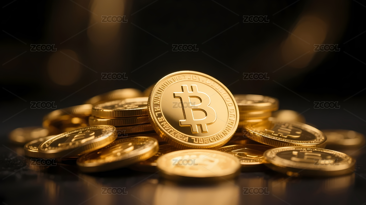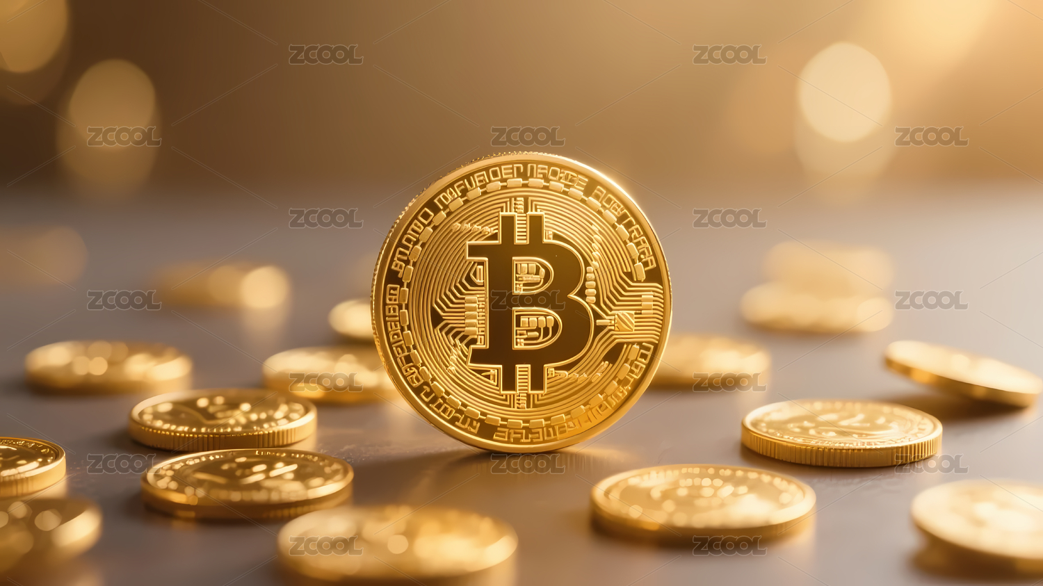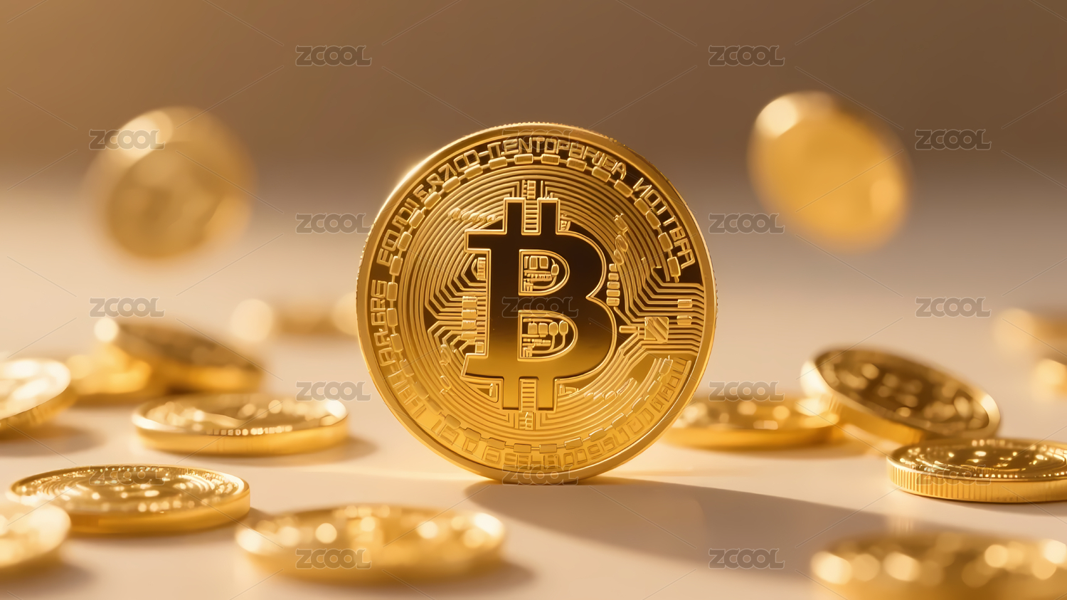金色比特币映衬金币光斑