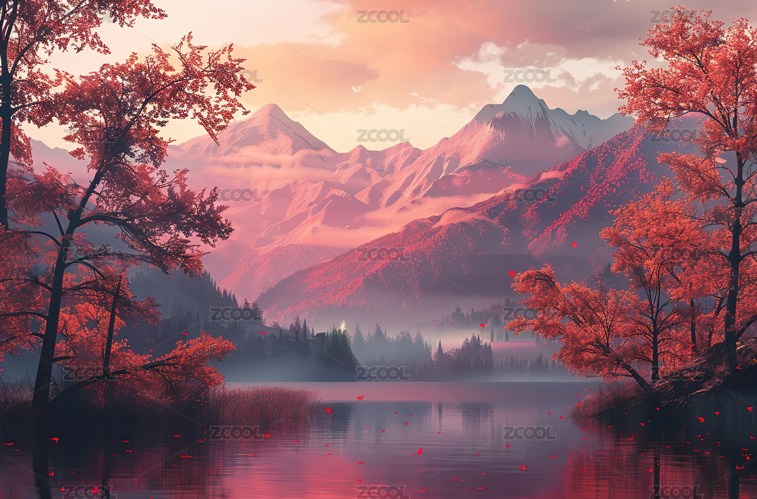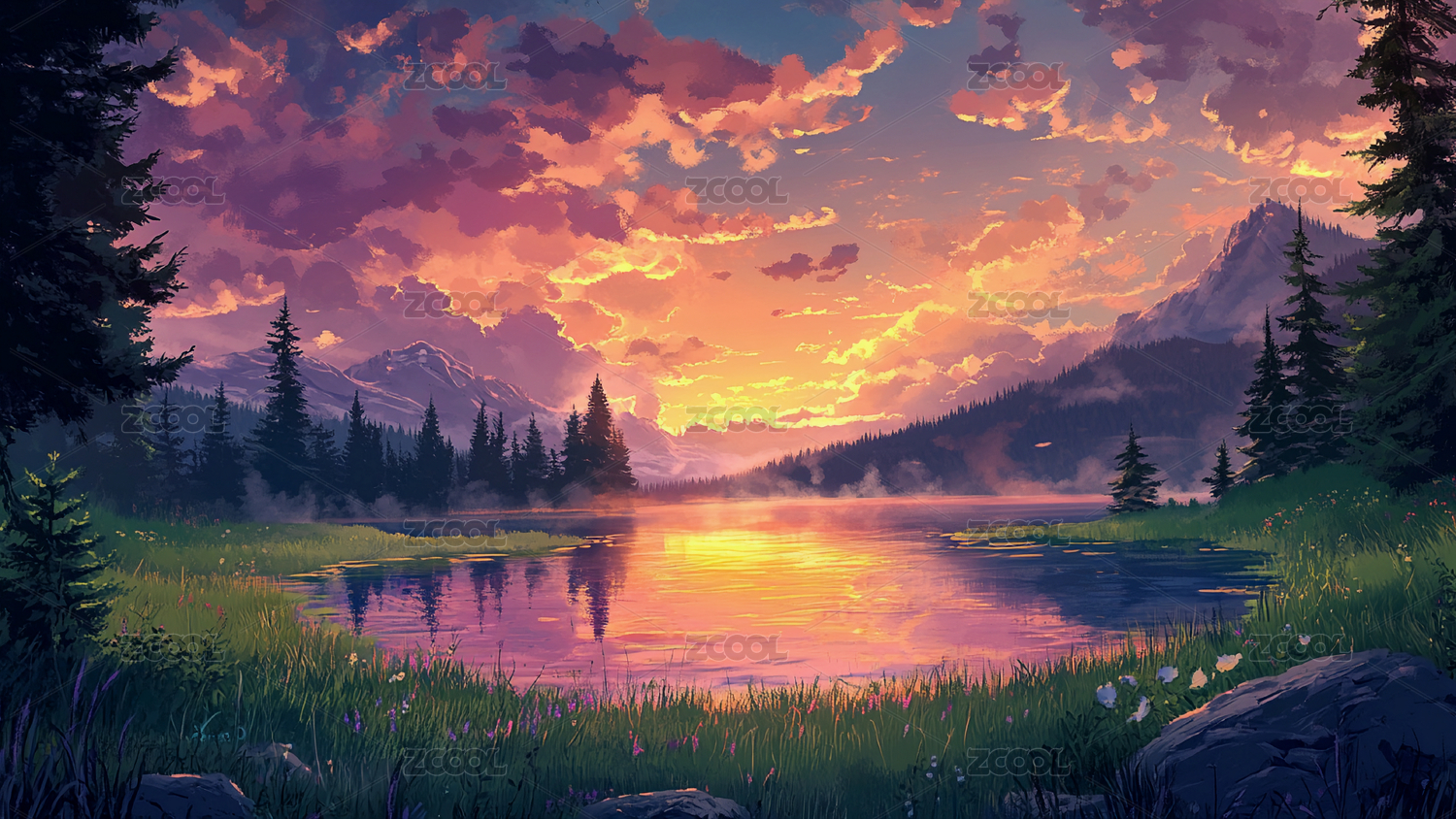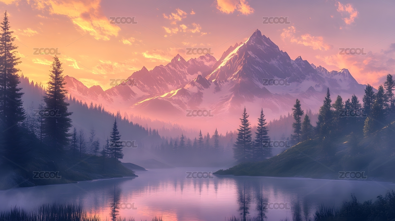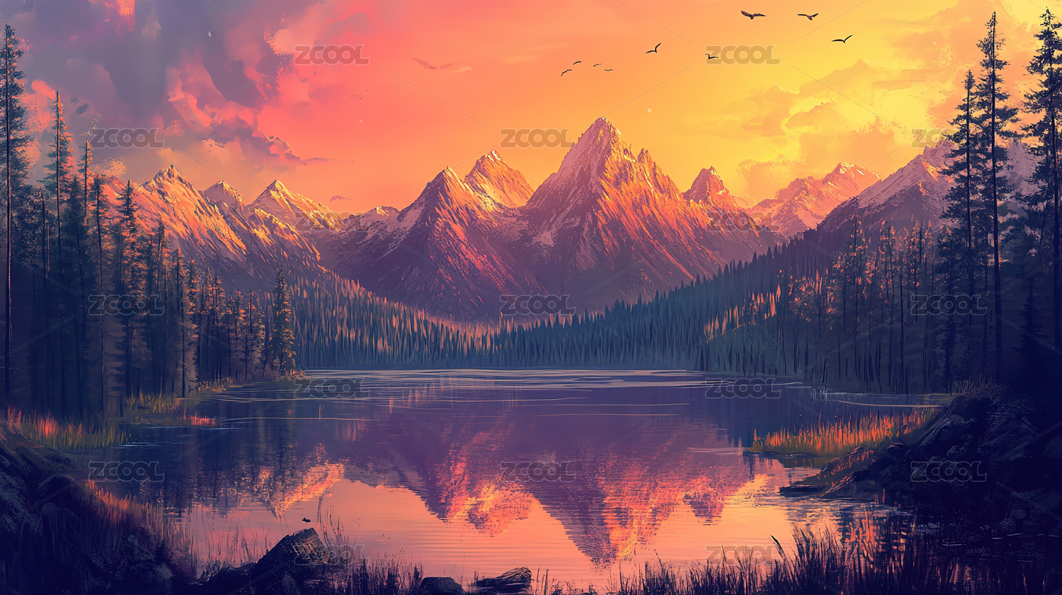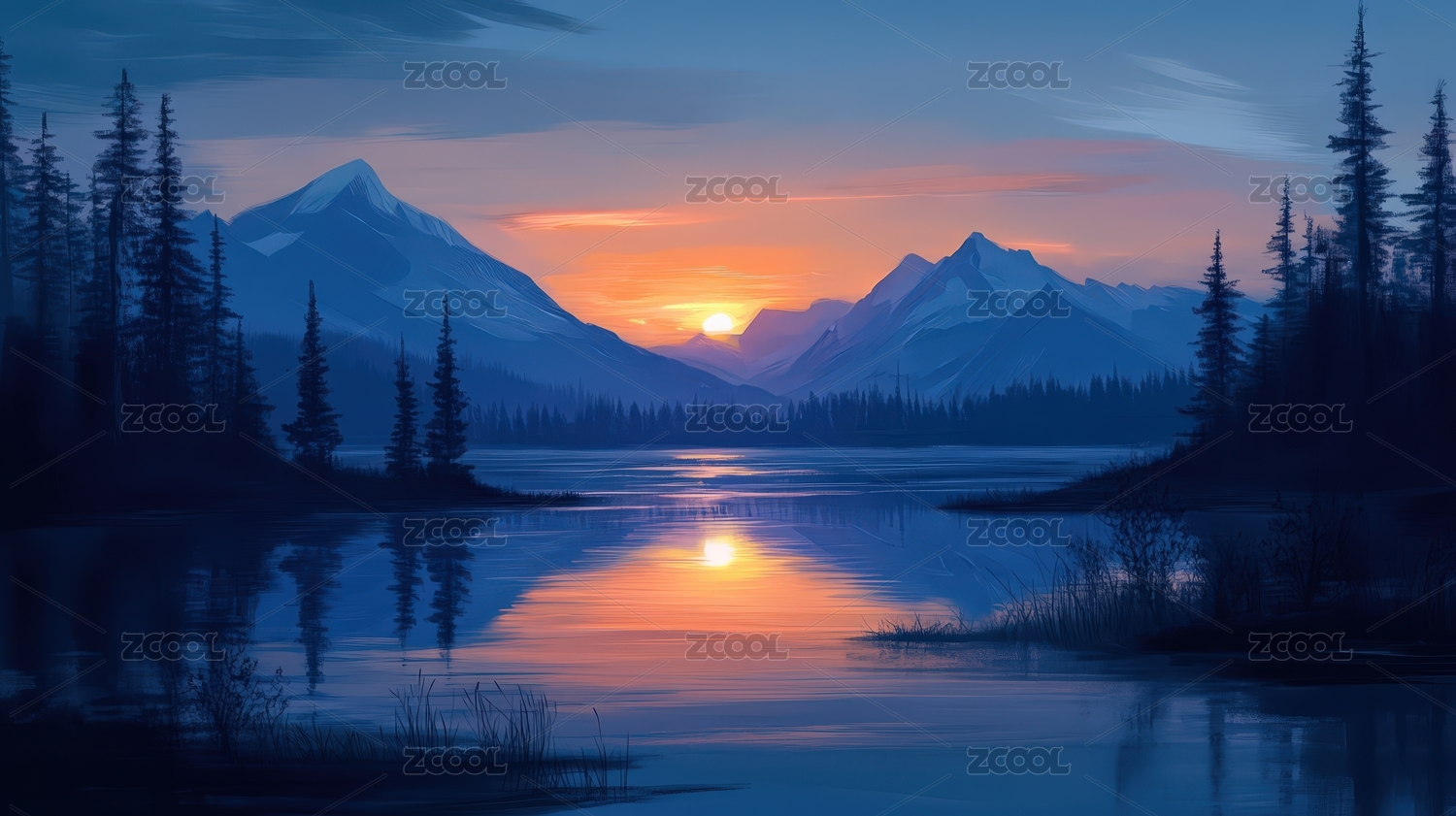 湖泊,日落,山脉,倒影,天空,云彩,树木,静谧,自然,风景