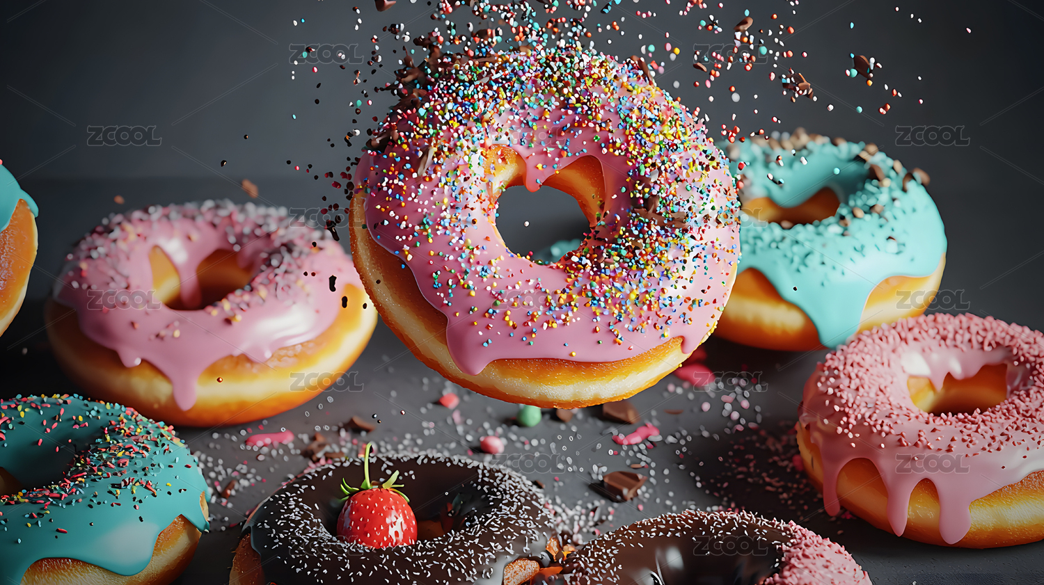 空中飘洒着糖粒彩色甜甜圈