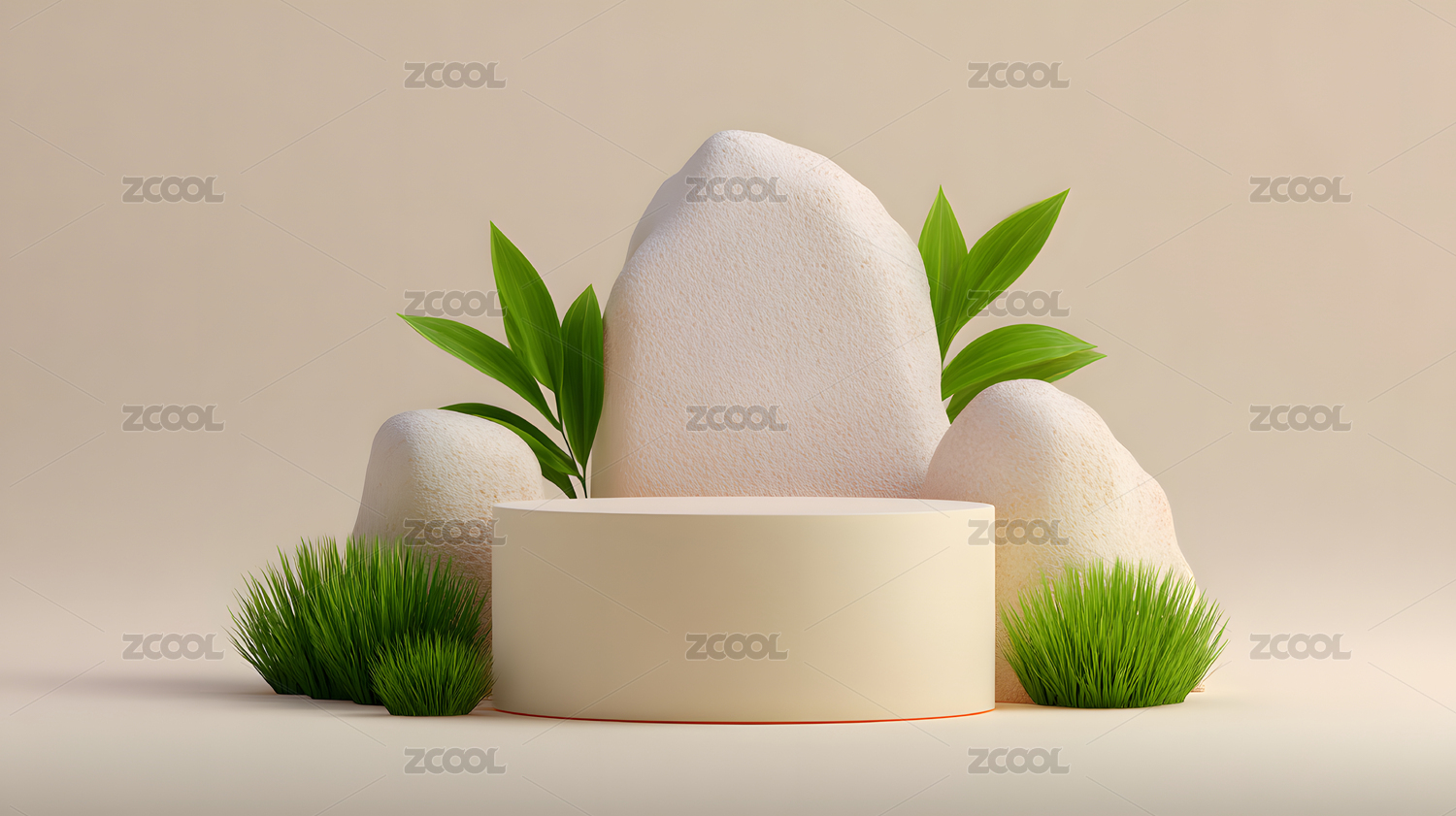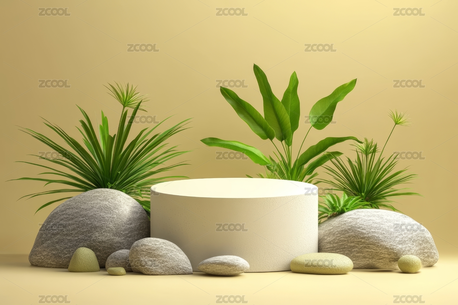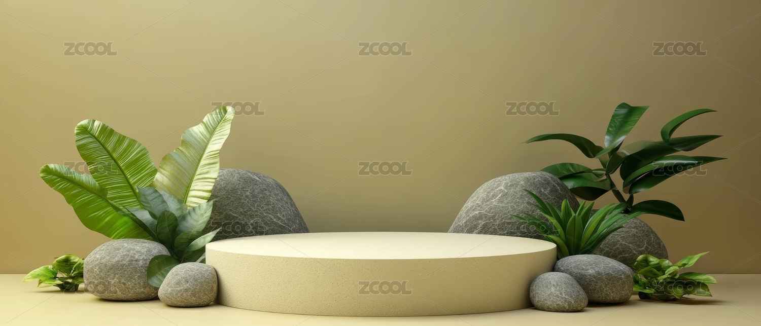 浅色背景前圆形展台旁有绿植和石头