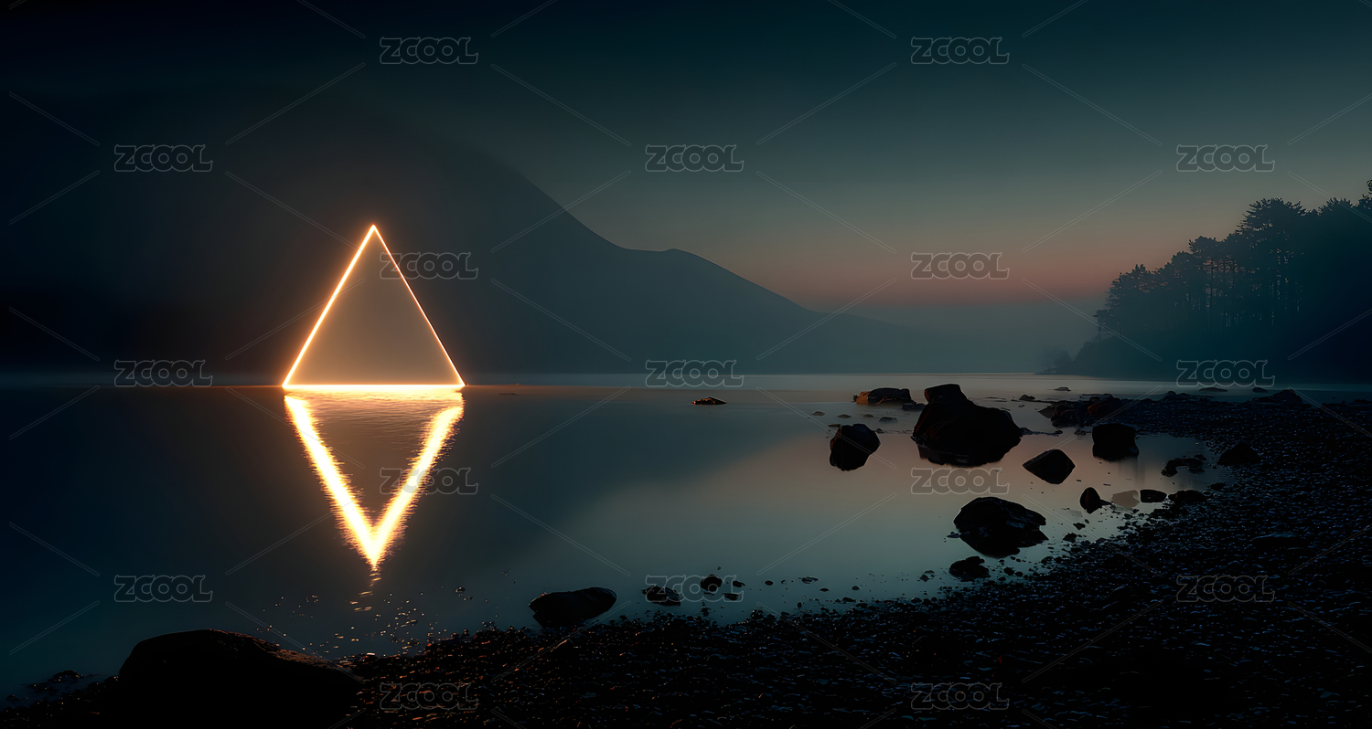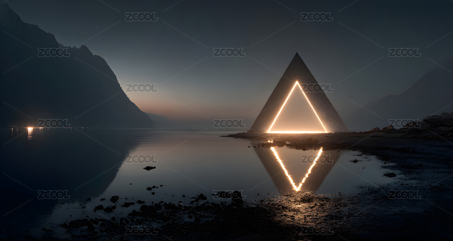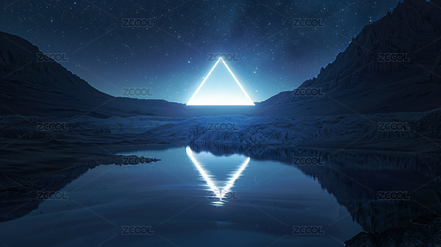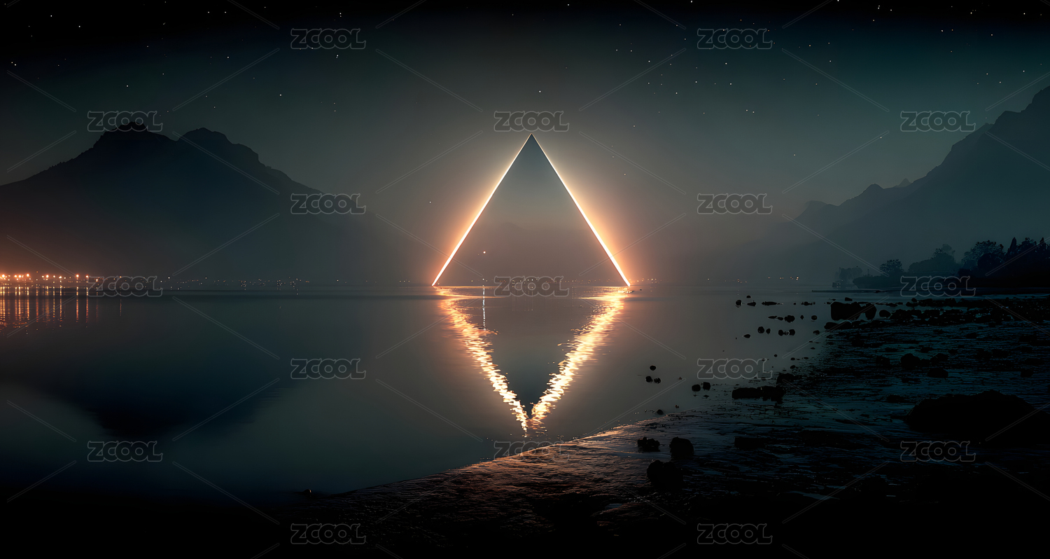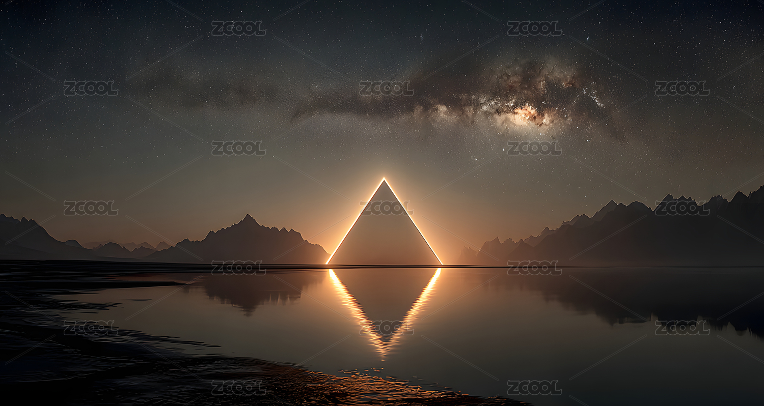 金字塔,星空,水面,山脉,反射,光芒,暗夜,倒影,宇宙,梦幻