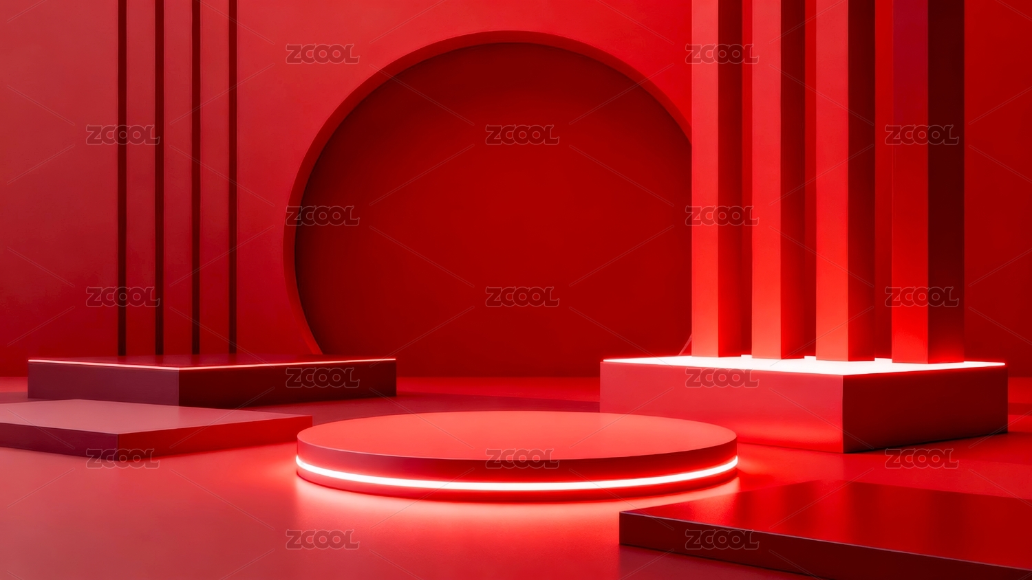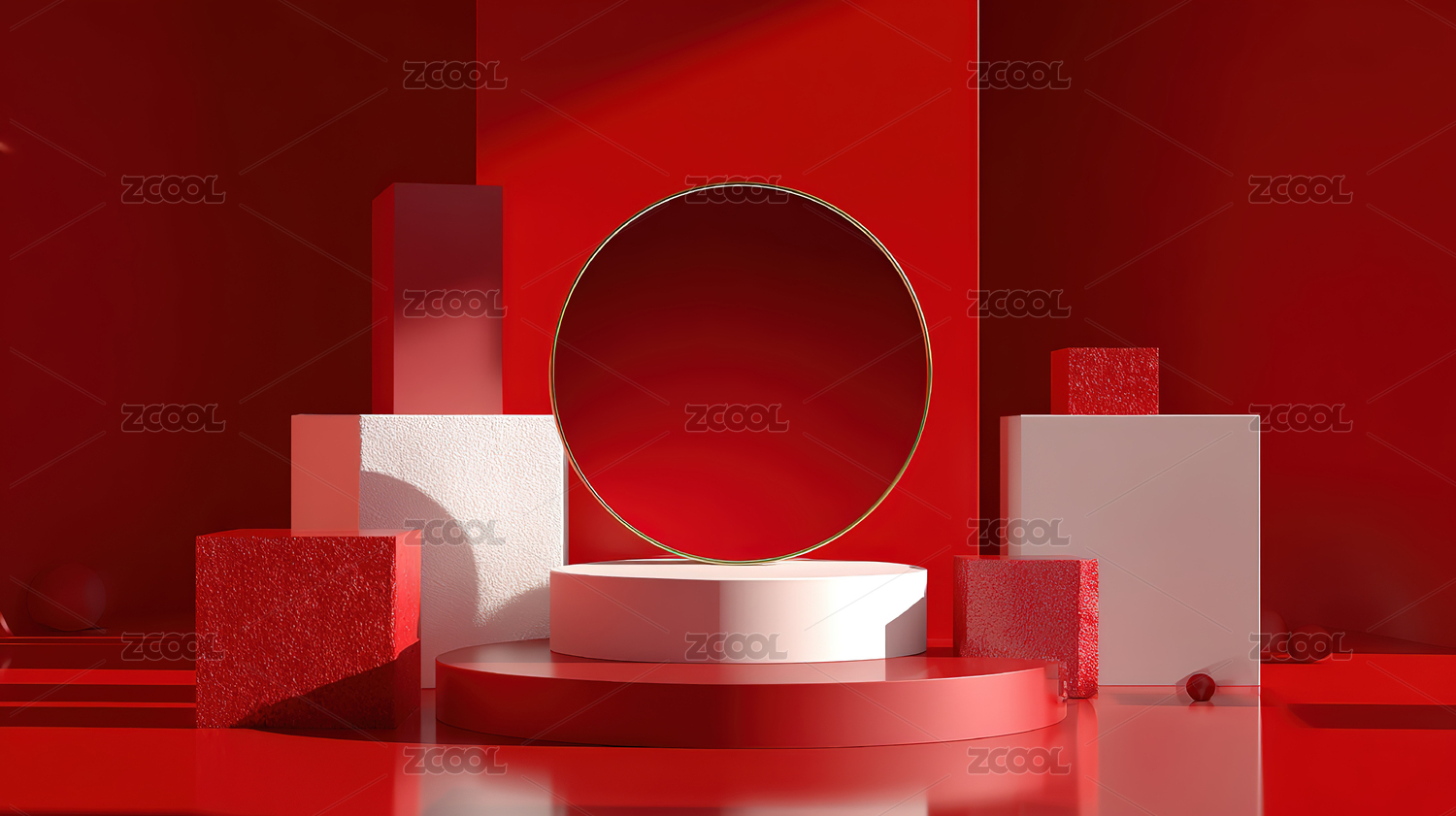 3D电商场景国潮圆形展台红色金色隔断装饰