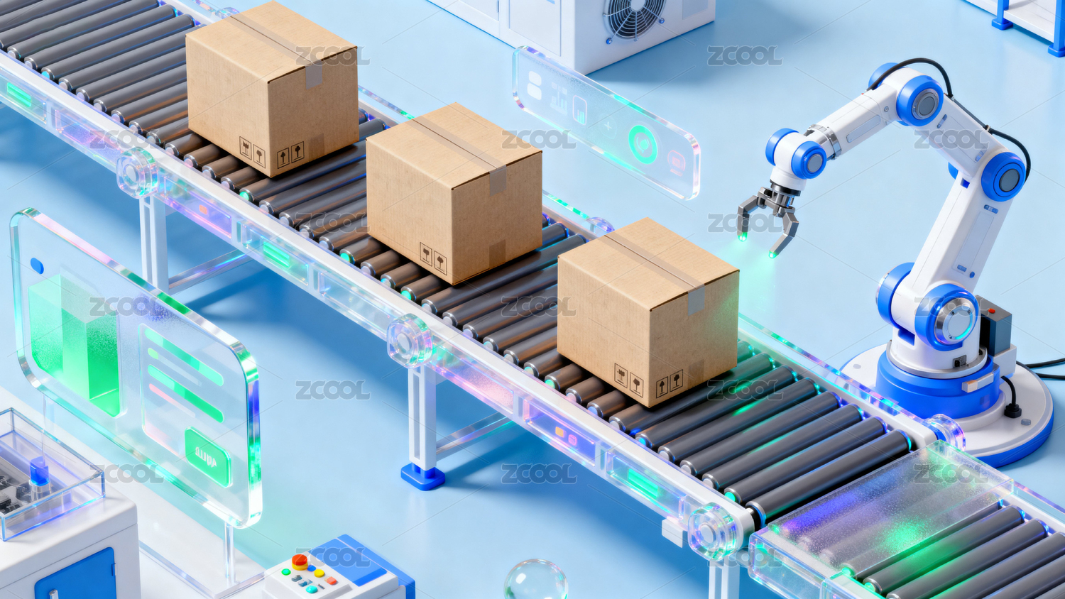 机器人,纸箱,传送带,自动化,蓝绿色,扁平化,图标,科技,包装,物流