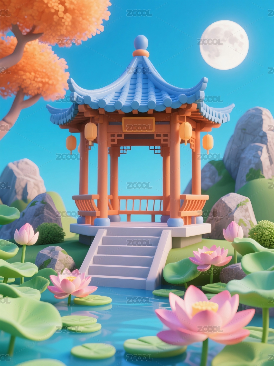 流水,亭台,峻岭,云朵,花朵,蓝天,金边,树木,祥云,碧波