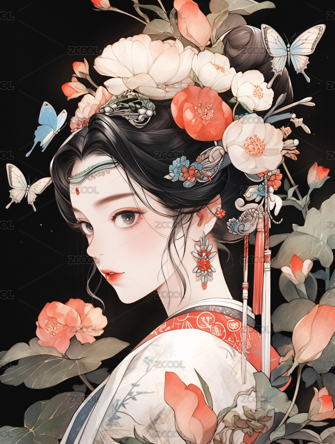 古风,眉眼,珠饰,发髻,额妆,耳坠,黛眉,朱唇,华服,流盼