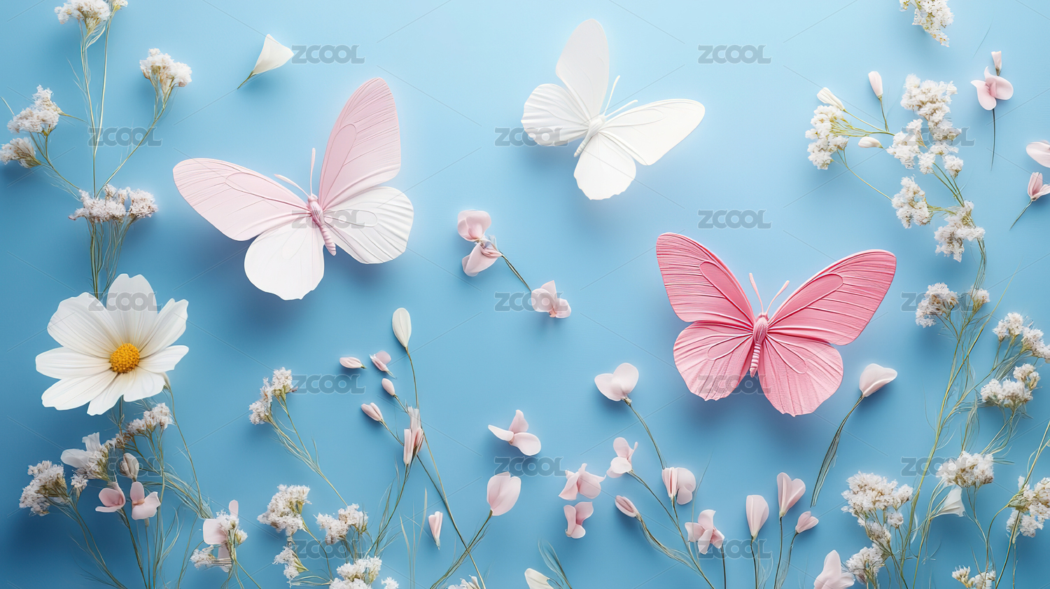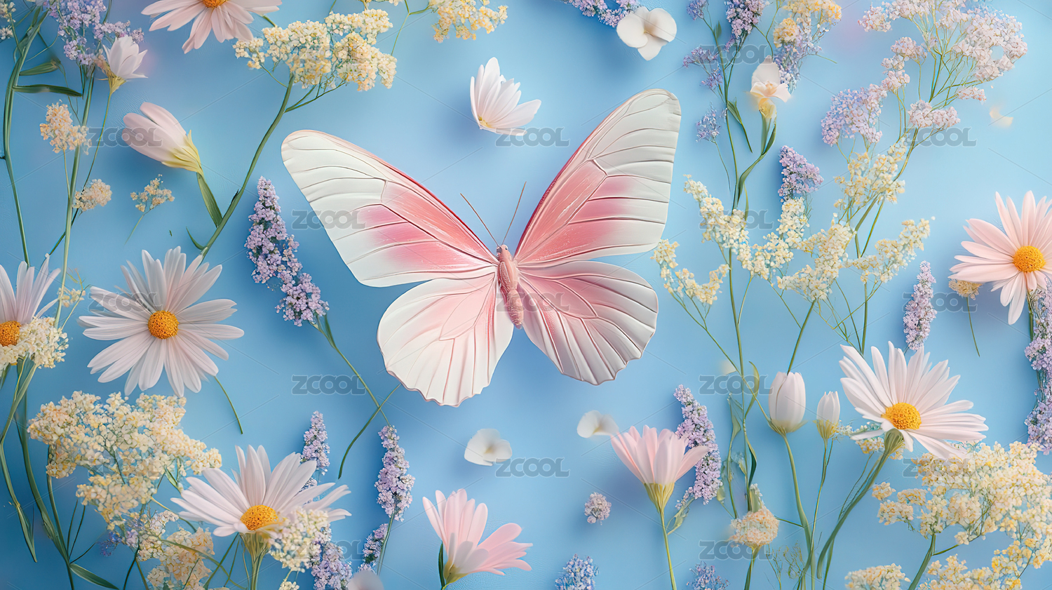 蝴蝶粉白色花卉停驻场景