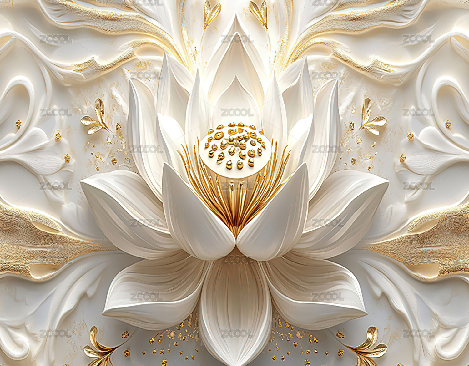 金色莲花盛开在雕刻着金色古典纹理背景上