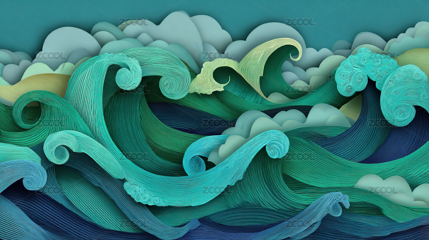 层叠海浪与云朵的艺术剪纸