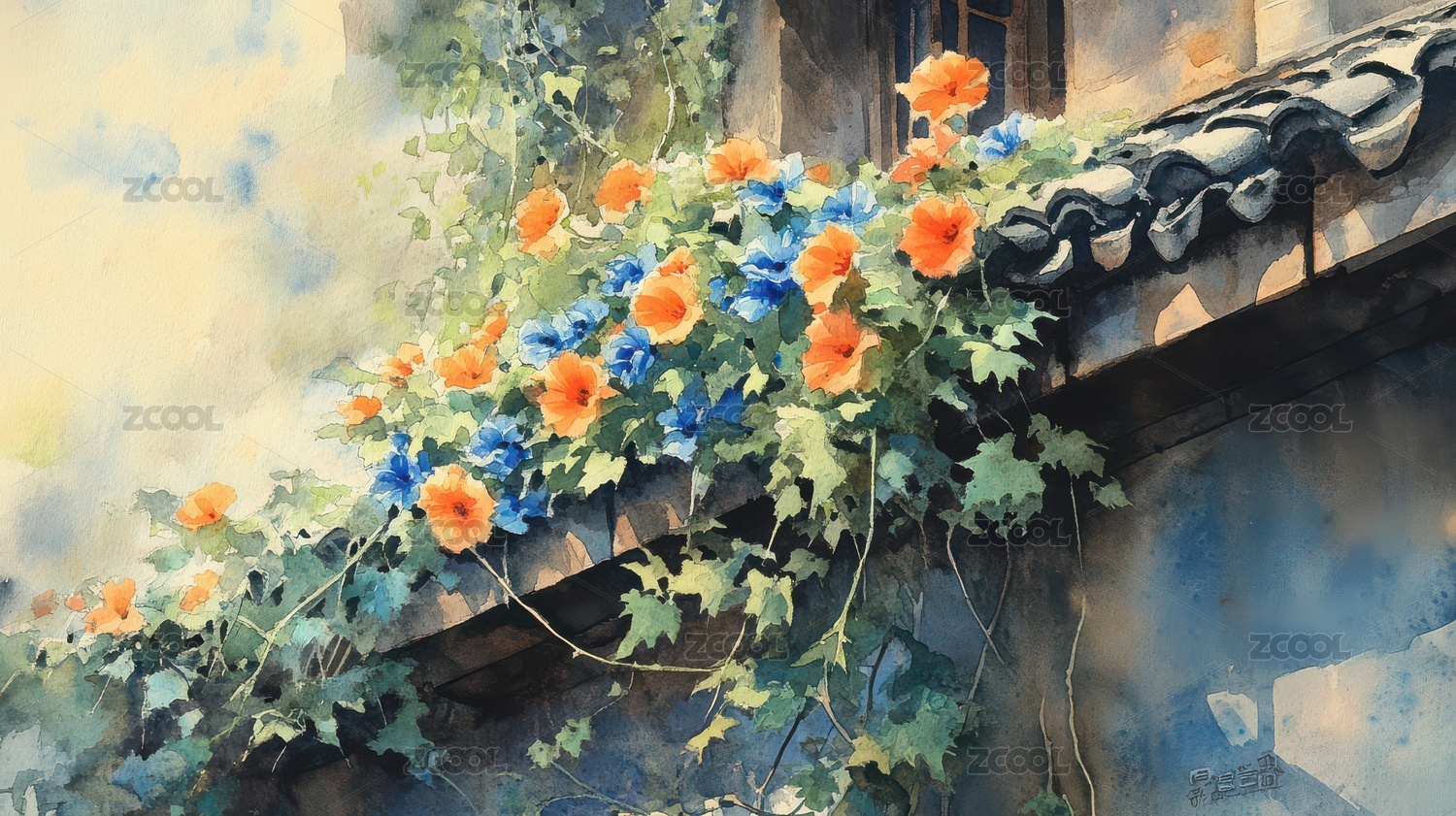 墙角藤蔓花卉的水彩艺术表现