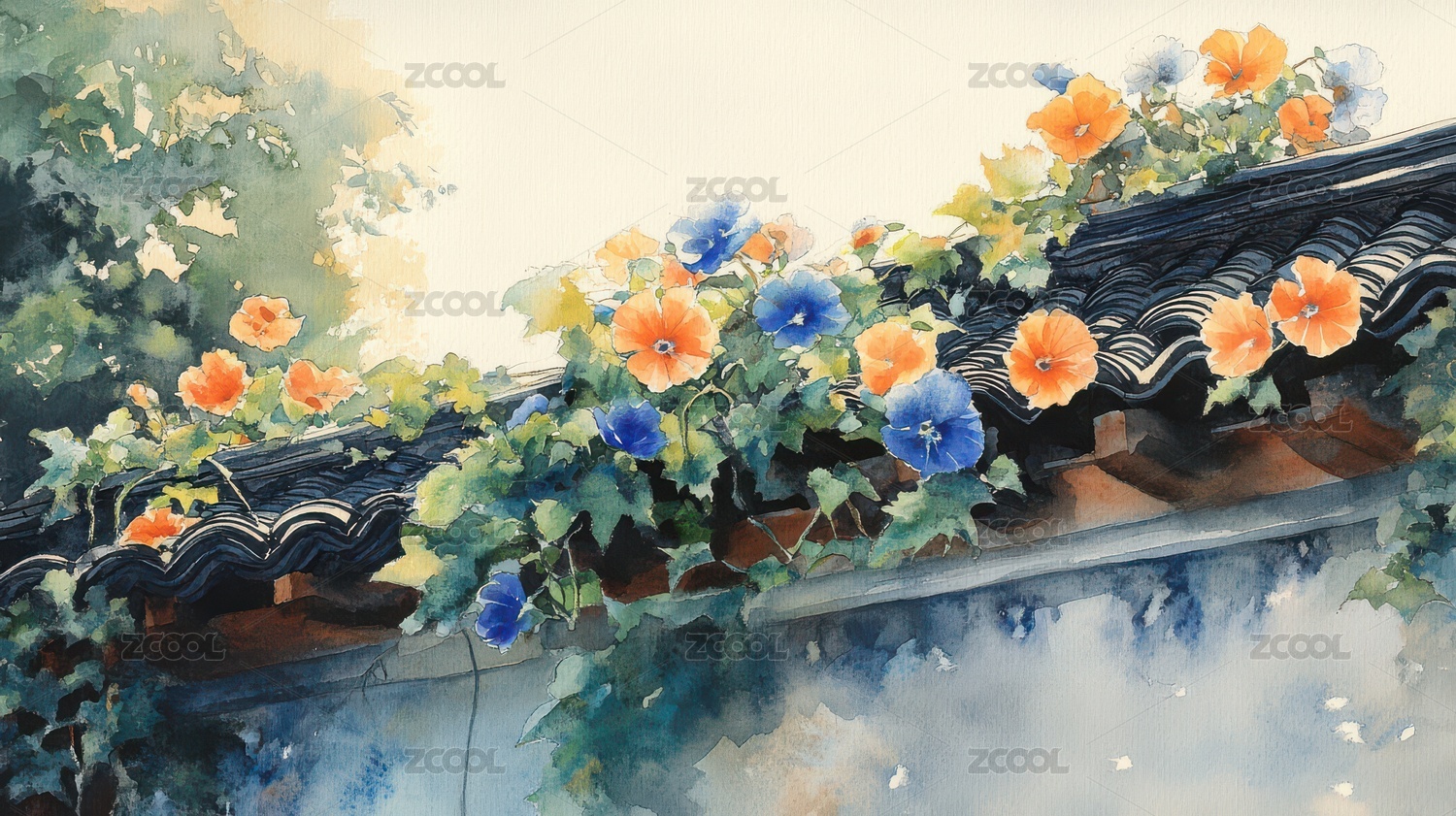 屋檐上的花藤与瓦片的和谐之美
