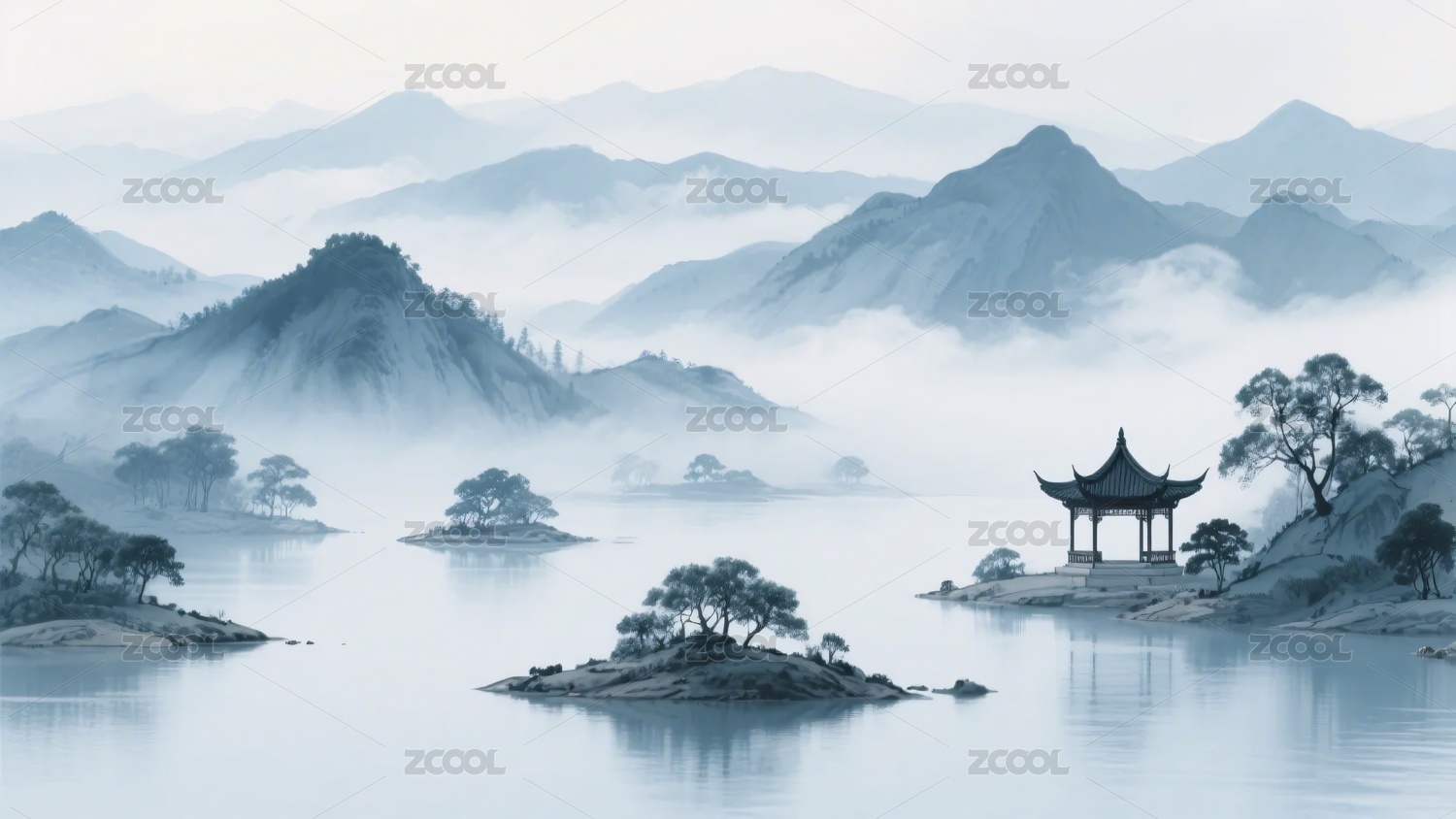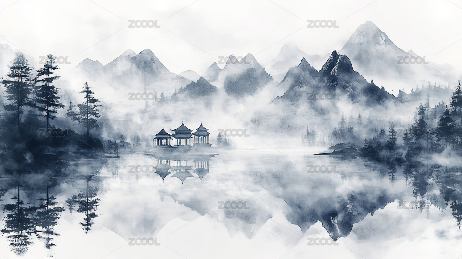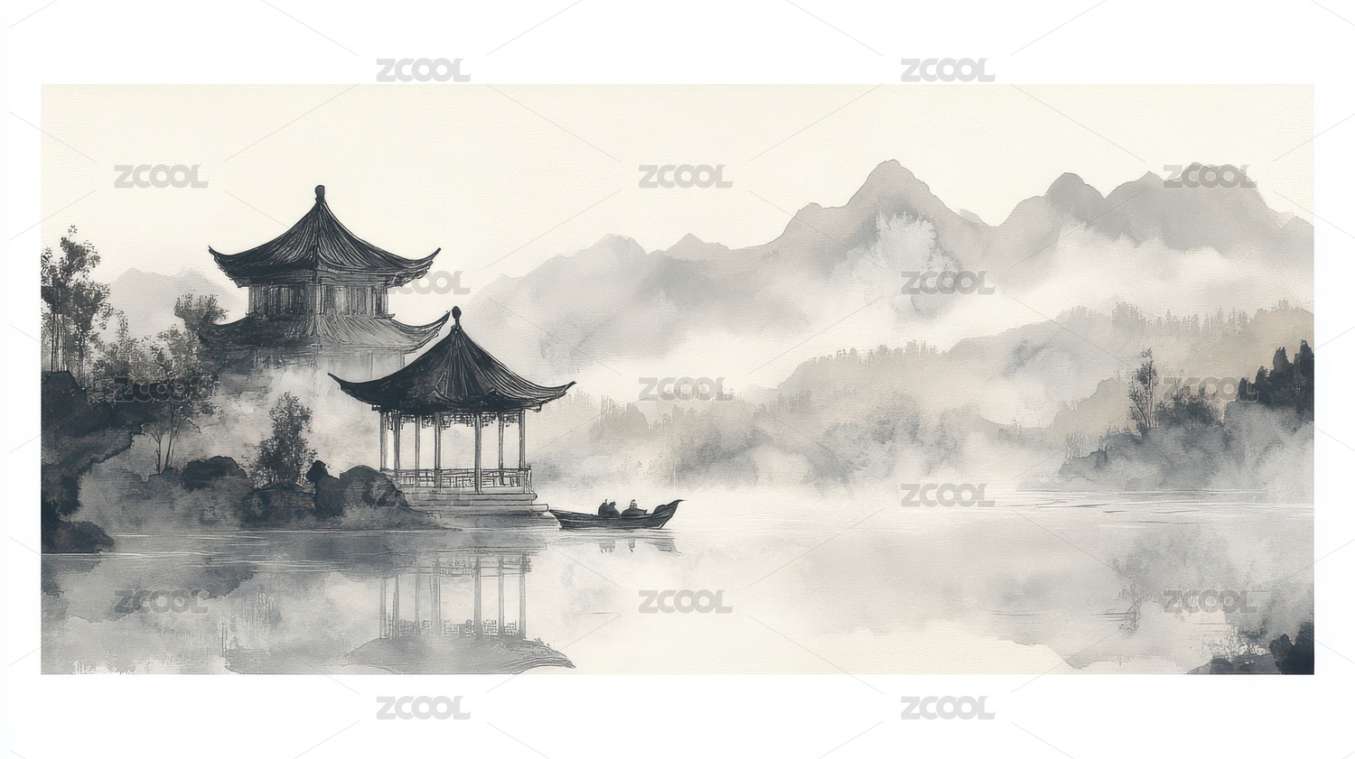 山峦,云雾,远处,山水,古亭,小舟,湖水,倒影