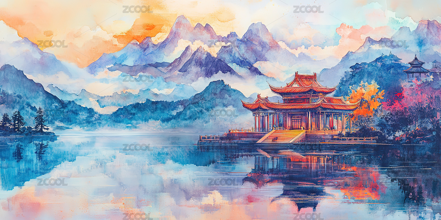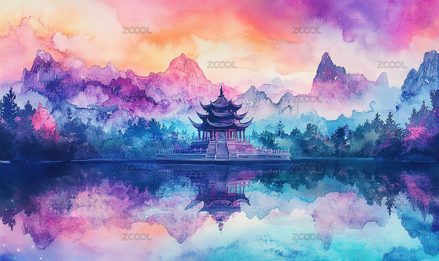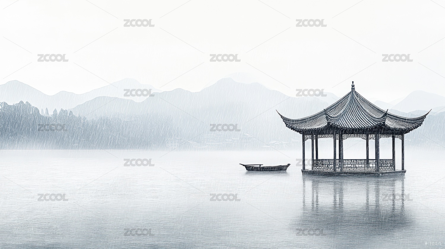 山峦,云雾,远处,山水,古亭,小舟,湖水,倒影