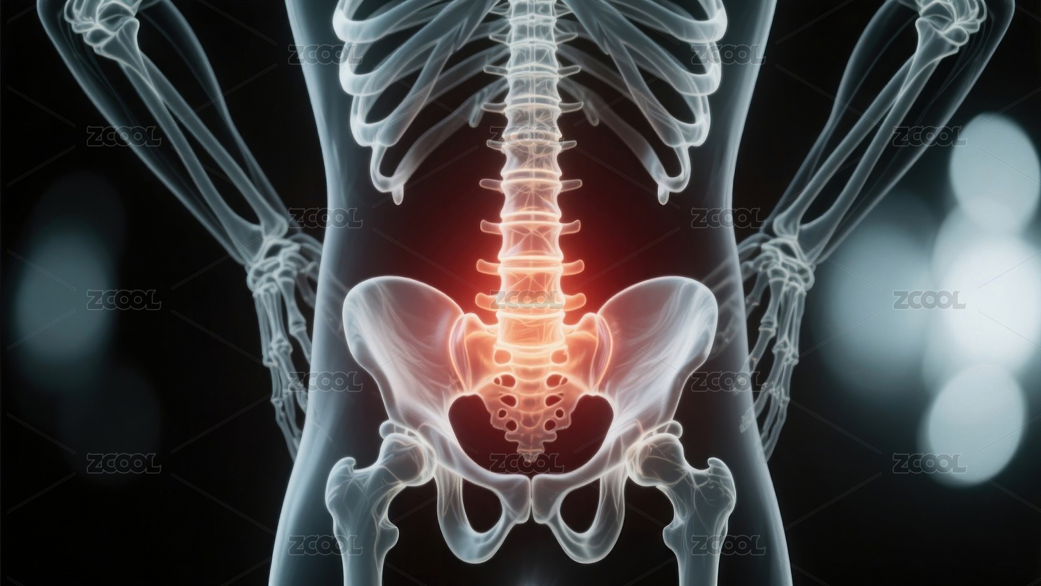 人体骨骼图示中腰部脊柱处发红且旁有人影