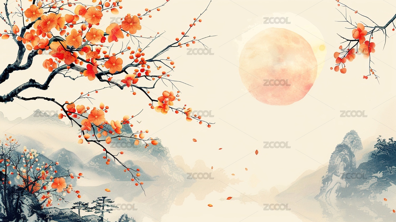 黄色花卉月亮下的木桌中秋节电商产品背景