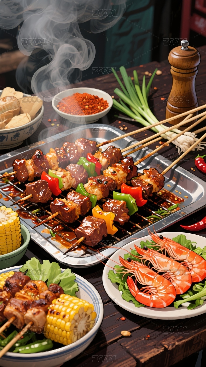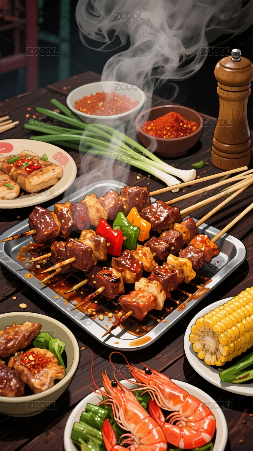 美食,插画,烤肉串,海鲜,蔬菜,烟火气,聚餐,美味,艺术,生活