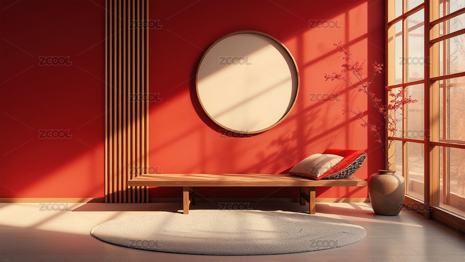 简约,日式,室内设计,红色墙壁,圆形装饰,木质家具,自然光,室内植物,阳光,阴影