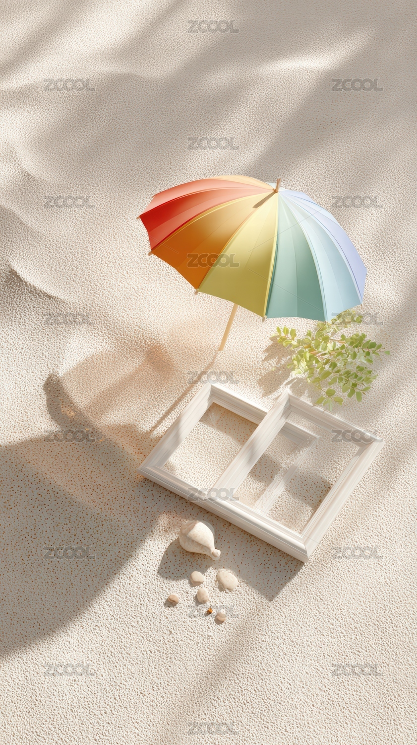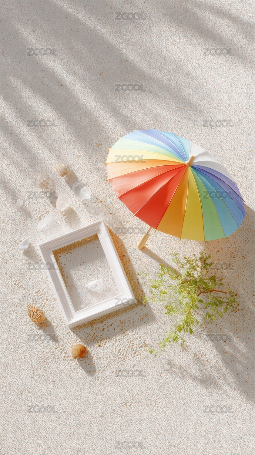 光影,绿植,彩虹,伞,沙地,白窗,石头,书籍