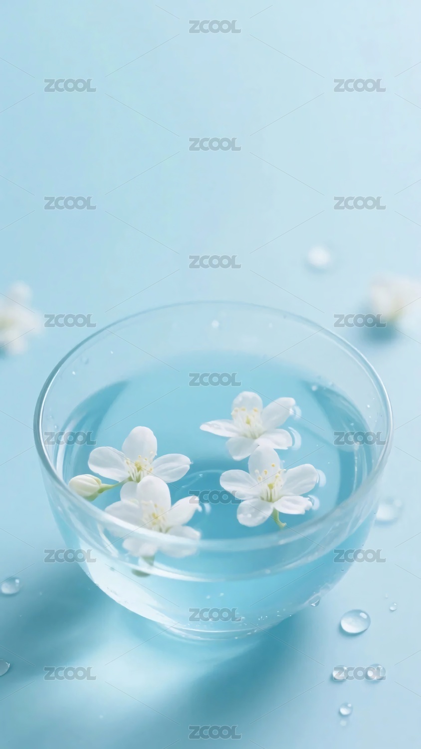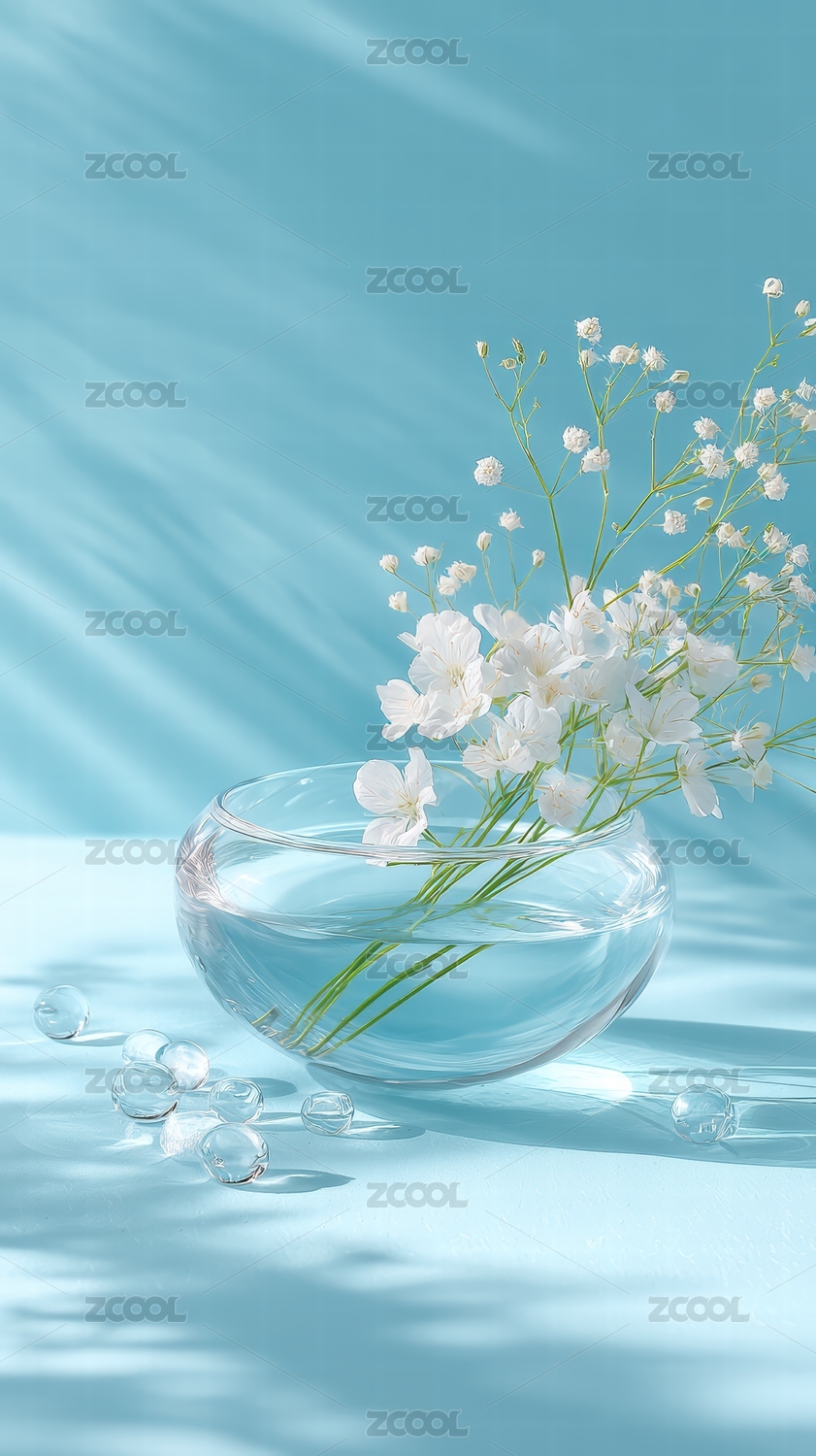清雅水碗中的白色小花与水晶珠