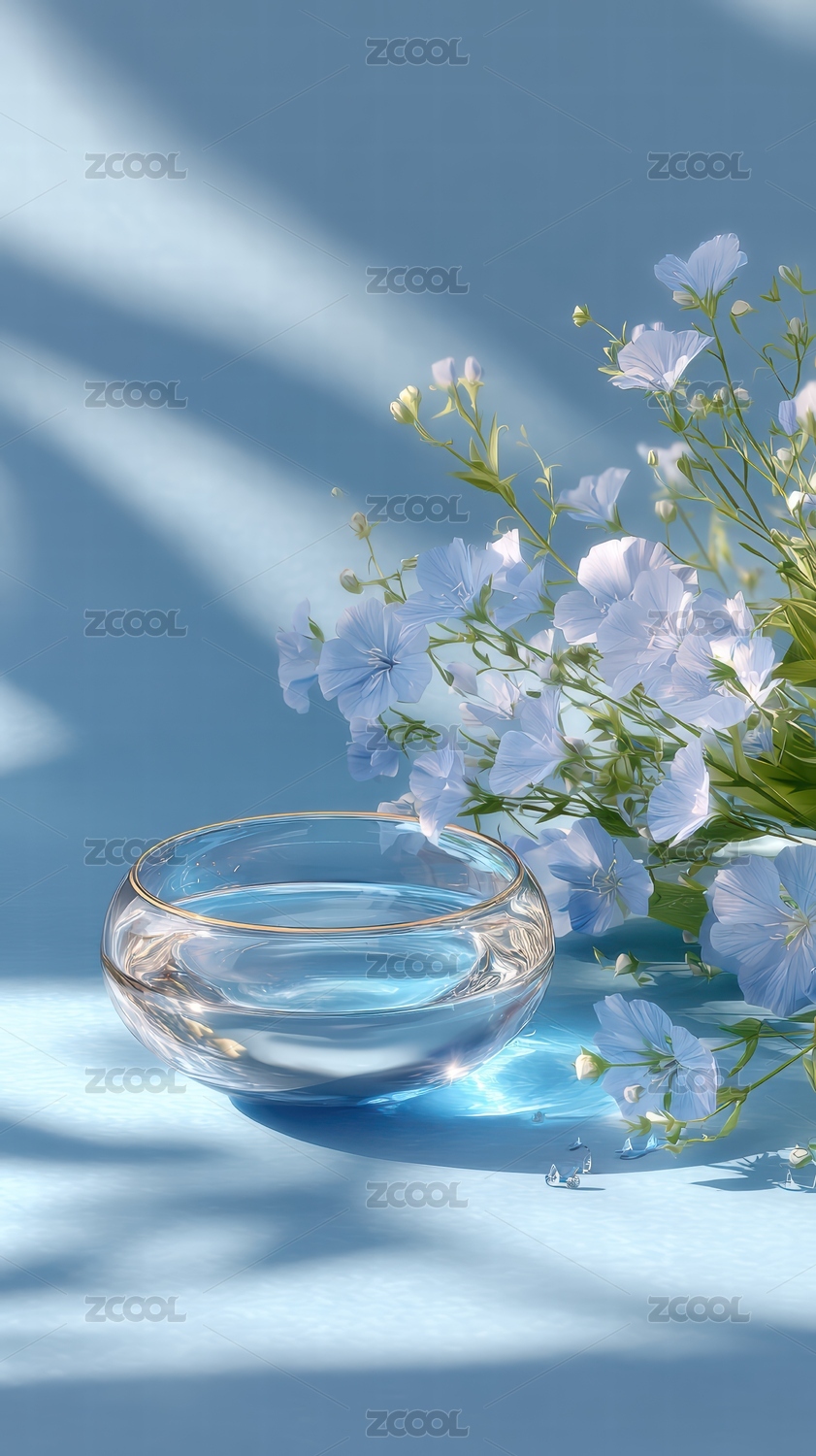 清澈玻璃碗与淡雅蓝花静美相映