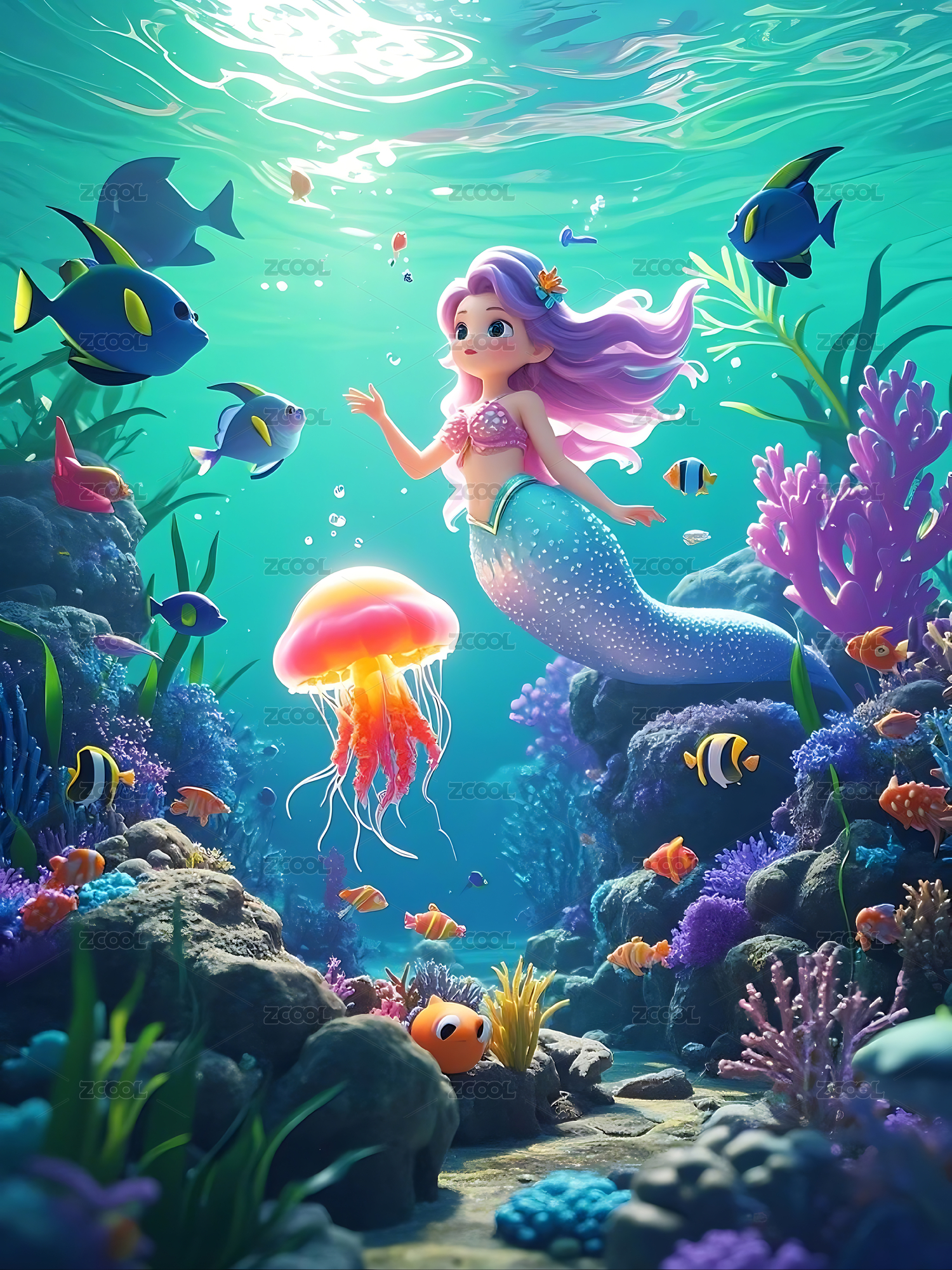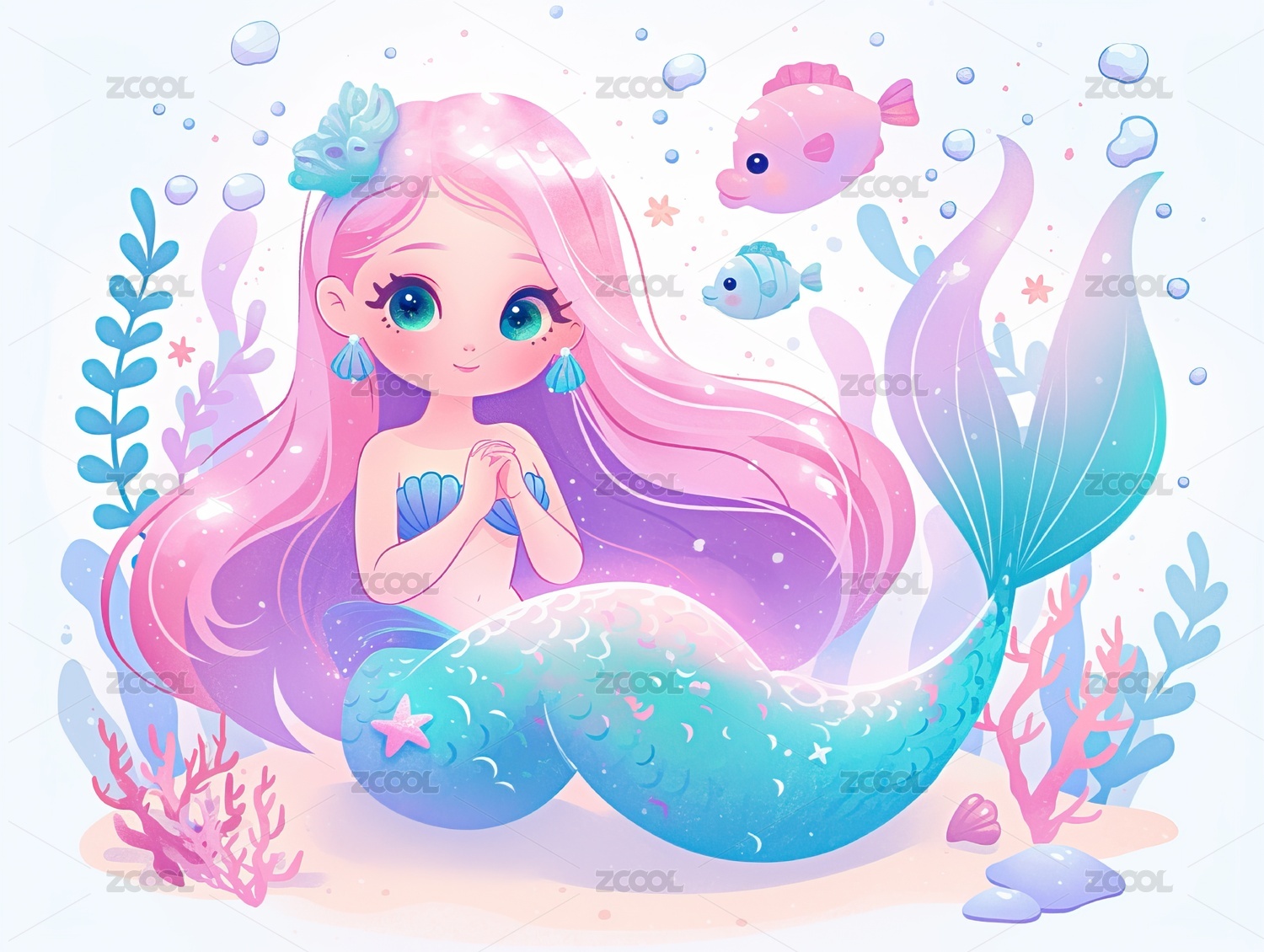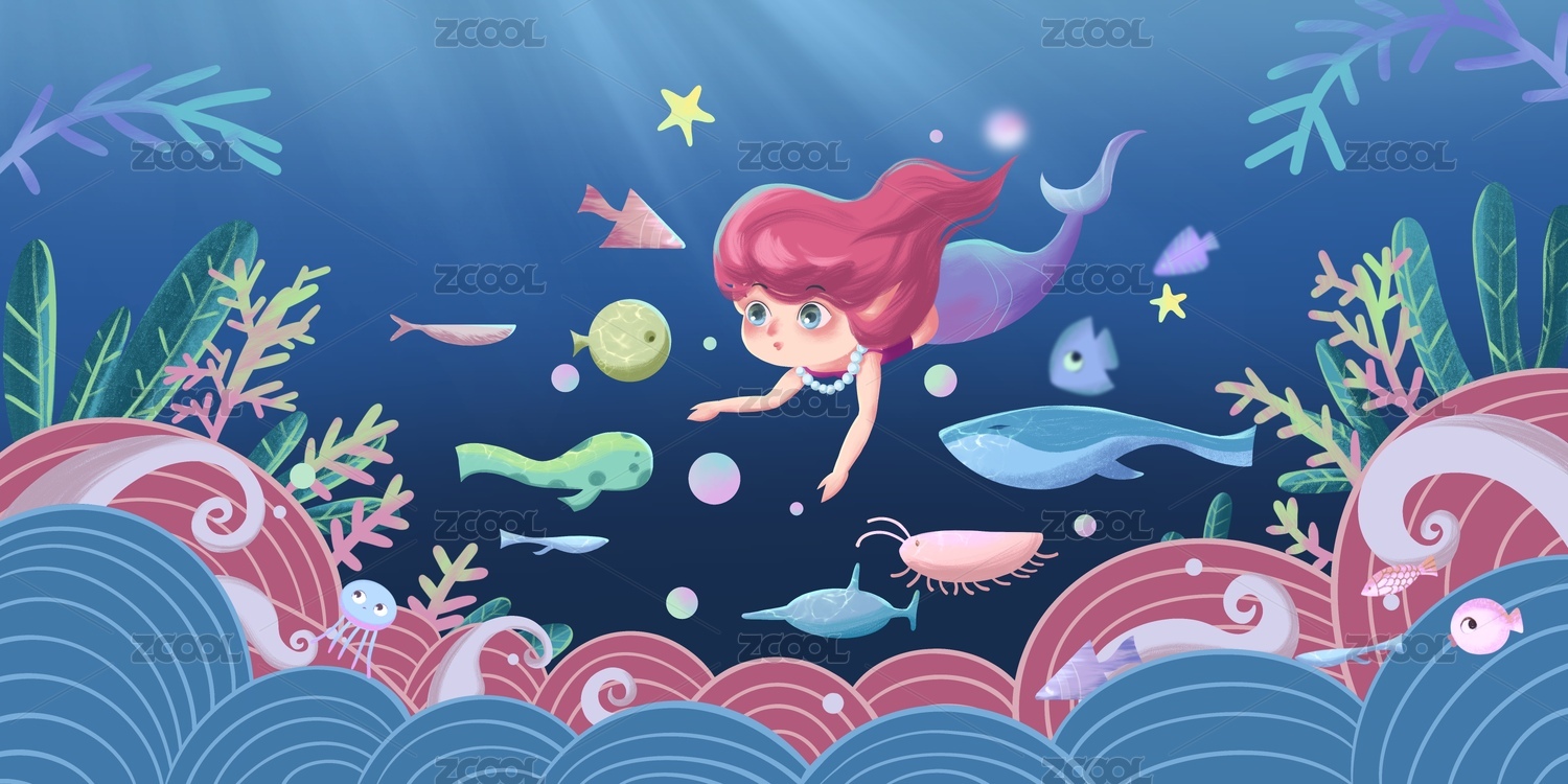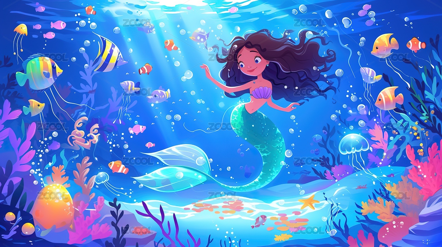 美人鱼与泡泡海底猴子鱼群珊瑚礁石多彩插画