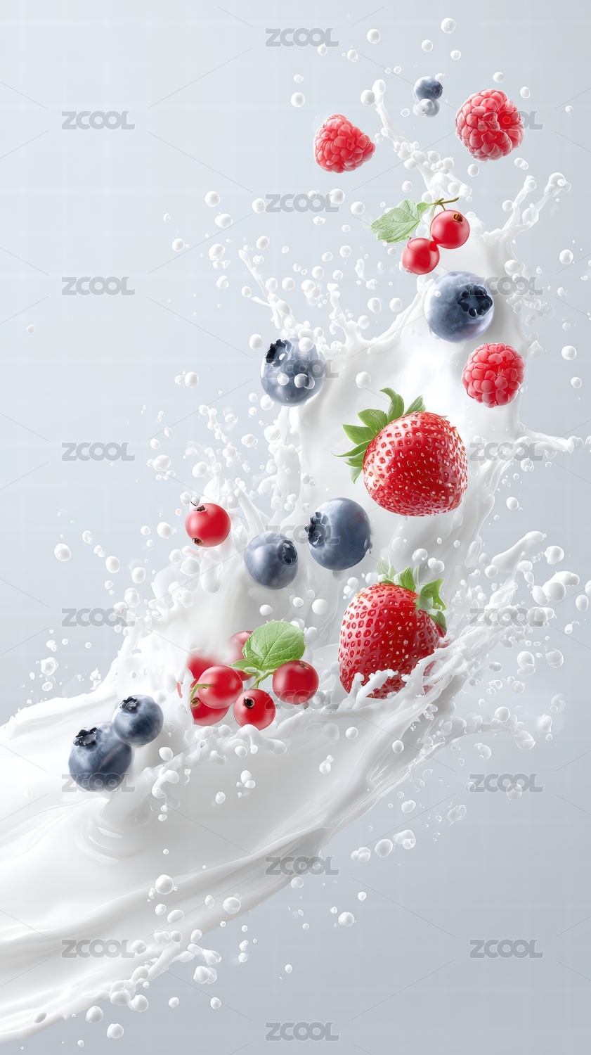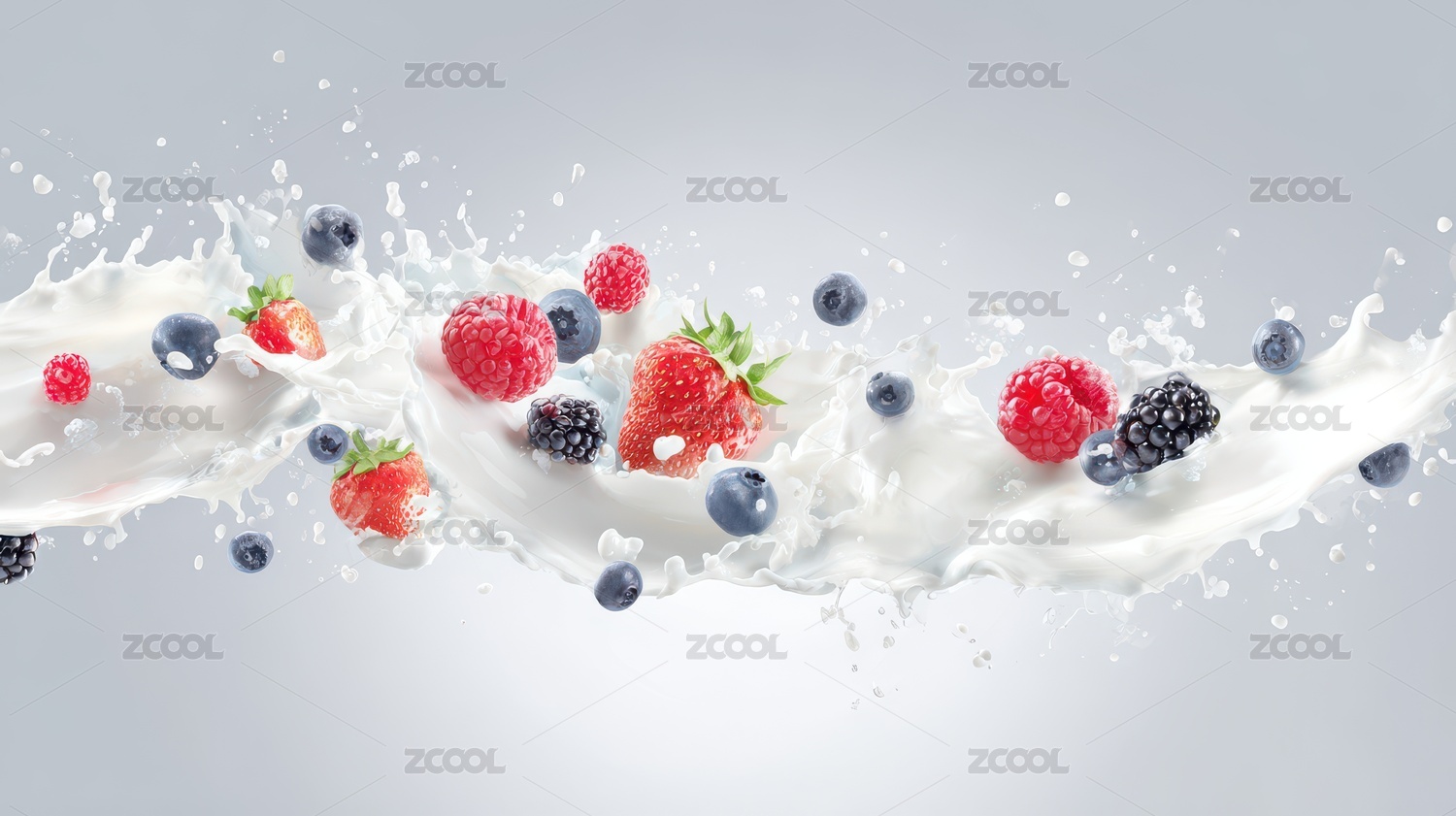 新鲜浆果与牛奶飞溅的瞬间艺术