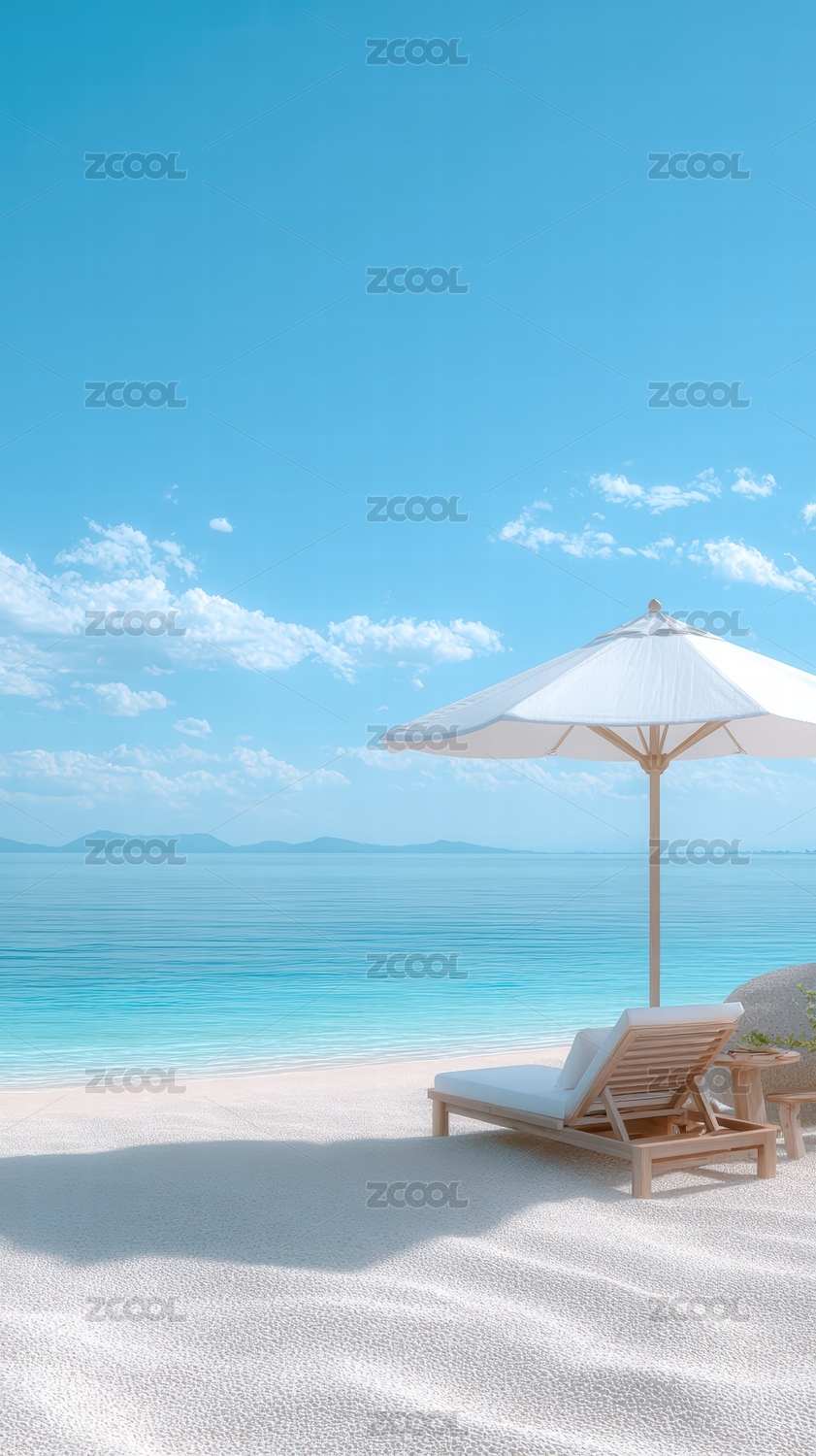 沙滩,海面,躺椅,遮阳伞,晴空,波浪,木椅,白色