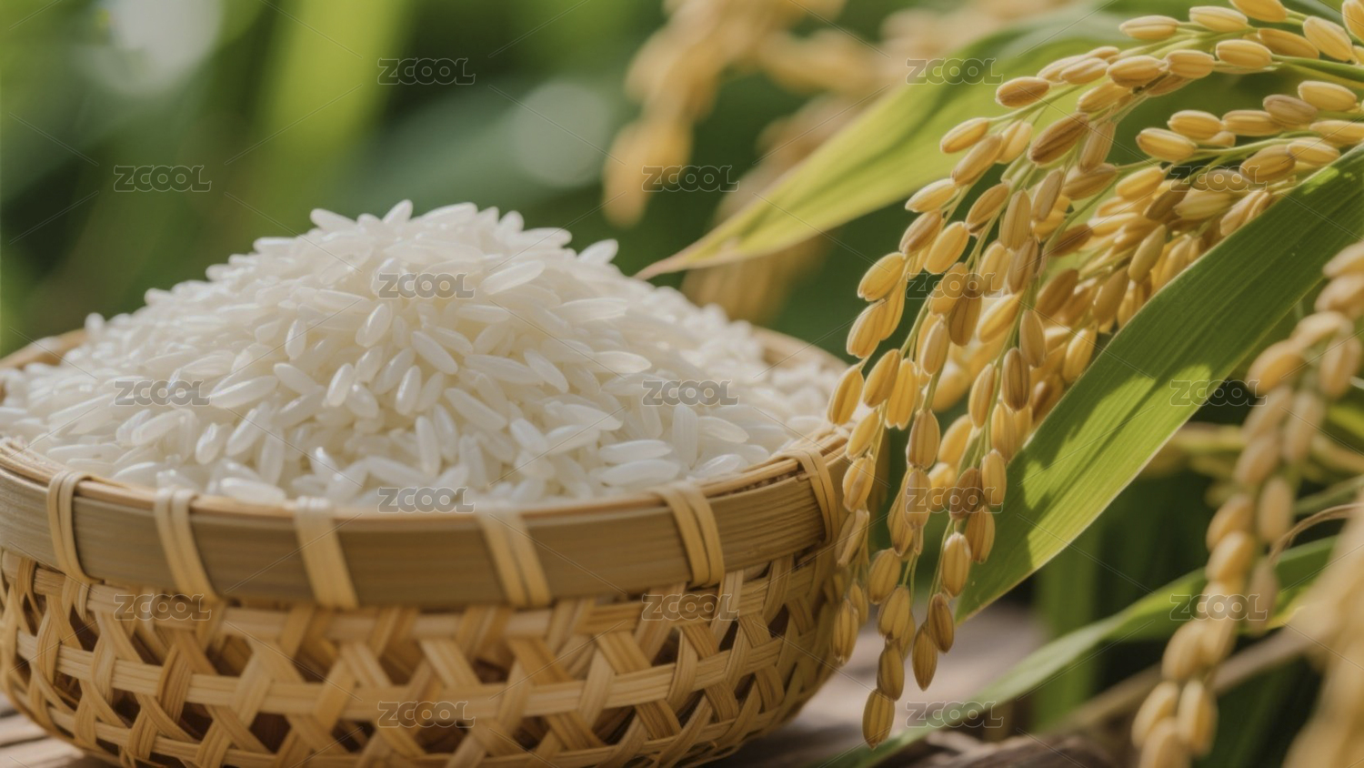 木质碗中白米与稻穗的自然静物