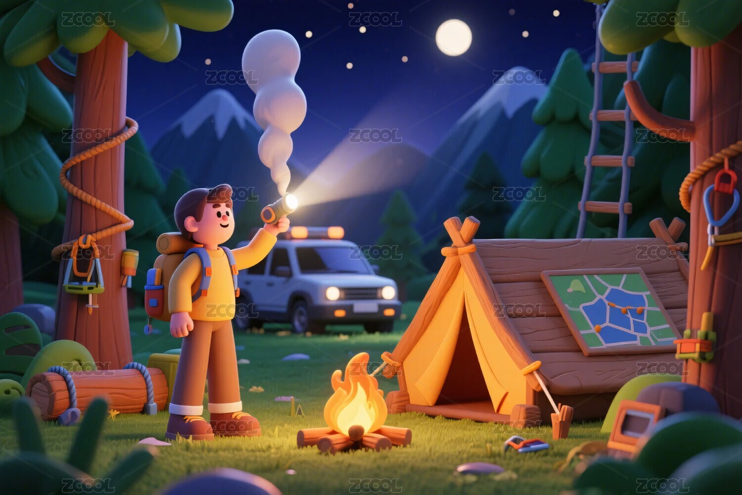 3D卡通人物户外露营