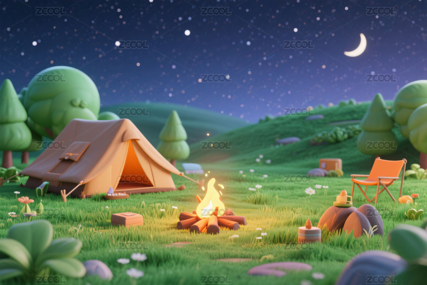 3d卡通朋友露营篝火聚会