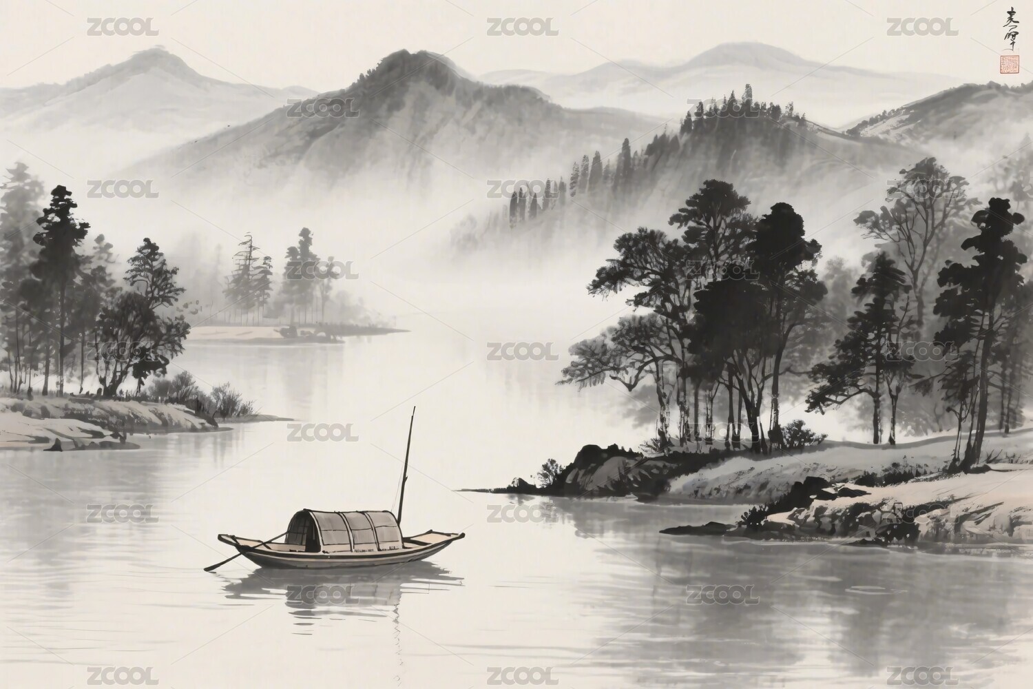 山水,孤舟,人物,水墨画,意境,插画,风景,自然,宁静,淡雅